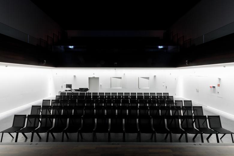 Der Veranstaltungssaal ist der Raum, in dem die Hauptaktivitäten stattfinden. Es handelt sich um einen zweistöckigen, geschlossenen Raum ohne Tageslicht-Öffnungen mit weißen Wänden, dunkler Decke und Holzfußboden. Ziel der Beleuchtung ist es, den Raum visuell zu erweitern und über die Bespielung der weissen Wände verschiedene Lichtstimmungen zu erzeugen. Die RGBW-Wandfluter sind umlaufend auf beiden Ebenen des Saals angeordnet. Der Lichtkegel dieser Lichtlinien ist sehr schmal, so dass das Licht nicht auf das Publikum fällt. Die Grundbeleuchtung erfolgt über Deckenfluter, die ebenfalls als RGBW-Farbwechsler für eine hohe Flexibilität in der Lichtstimmung sorgen. Die gesamte Innenbeleuchtung ist farbveränderlich (RGBW-Licht) und es gibt definierte Lichtszenen, die vom Nutzer ausgewählt und überschrieben werden können. Die Steuerung erfolgt über einen Touchscreen für die Alltagsnutzung oder ein umfangreiches Lichtmischpult, für die Lichtsteuerung bei Anlässen. Unter der Empore sorgen Einbaustrahler für die Grundbeleuchtung vor der Cateringzone.