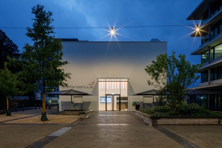 Betrachtet man das Elefantehuus von außen, so erscheint das Gebäude als puristischer rechteckiger Körper mit einer Öffnung in der vorderen Mitte, wo sich der Eingang befindet. Dies ist der einzige auffällige Teil des Gebäudes, der auf die aktuelle Nutzung hinweist. Aus diesem Grund hängen lange, geometrische, halbtransparente Lichtpaneele von der Decke bis zum oberen Teil des gläsernen Eingangs. Ergänzt wird die Installation durch einen farbveränderlichen RGBW-Wandfluter, der die weiße Wand im Hintergrund mit Licht in verschiedenen Farbtönen anstrahlt. Für die Grundbeleuchtung sorgen Strahler.