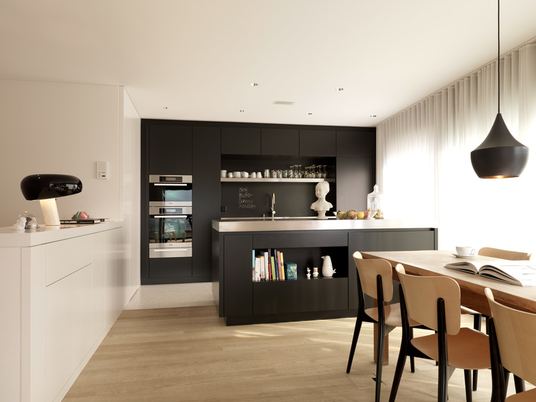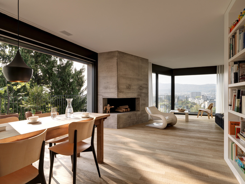 Hürlemann schuf für eine Familie eine 130 m2 grosse Raumskulptur auf zwei Ebenen. Die Wohnung hat eine offene Struktur – nur das Kinderzimmer und die beiden Bäder verfügen über Flügeltüren. Das Elternschlafzimmer in der Raumerweiterung am Ende des Flurs kann zusammen mit Bad und Studio mittels Schiebetüre zu einer Ruhezone abgetrennt werden. Dank zwei Reduits und zahlreichen Einbauschränken kommt die Wohnung ganz ohne zusätzliche Stauraummöbel aus. So trennt im EG ein 13 m langer, von beiden Seiten bespielbarer Schrankkörper aus Räuchereiche die Zimmer vom Flur.