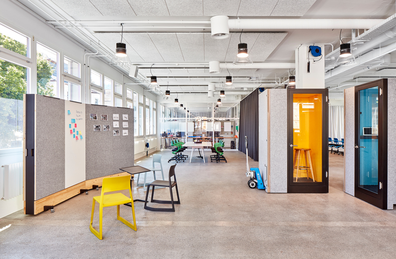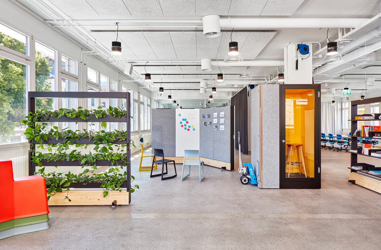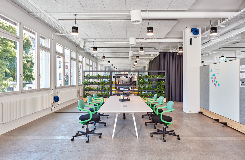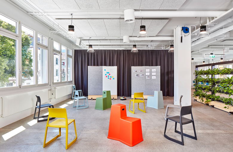Dank dem neuen Wand- und Möblierungssystem von Stephan Hürlemann ist jeder Bereich unterschiedlich nutzbar. Mit fahrbaren Modulen – darunter Wände, die individuell mit Schallschutz-Elementen und Whiteboards bestückt werden können, Bildschirmwagen, Regale, Garderoben und Pflanzenwagen – kreieren die Mitarbeitenden jene Arbeitssituationen, die sie gerade benötigen. Im Handumdrehen gestalten sie einen Meeting Corner zu mehreren Arbeitskojen, ein Präsentationsforum zum Rückzugsort oder eine Bibliothek zur Gäste-Garderobe um. Ergänzt hat Hürlemann das innovative Konzept durch eine eigens entworfene schalloptimierte Telefonbox, die mit einem Hubwagen versetzt wird. Ein radikales und bewusst einfach gehaltenes Elektrokonzept unterstützt die Wandelbarkeit der Räume.