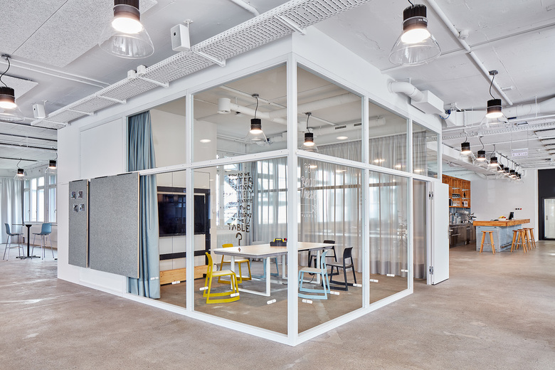 Als Bühne für PwC’s neues Experience Center dienen zwei Stockwerke in einem Gewerbehaus mit einer Gesamtfläche von 1’500m2. Der gängige Empfangstresen wurde durch eine Kaffeebar ersetzt, die als zentraler Begegnungsort der Firma zum Auftanken, Arbeiten und Spielen einlädt. Die Bürofläche wird durch wenige verglaste Räume strukturiert und mit mobilen Akustikvorhängen können unterschiedliche Zonen gebildet werden.