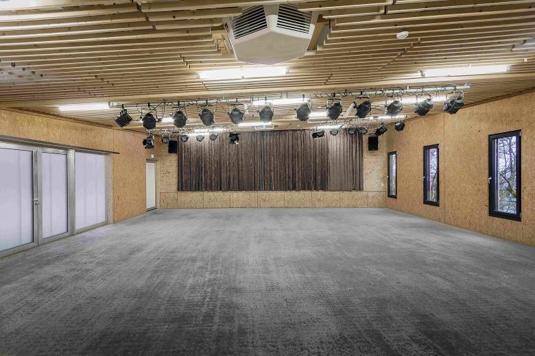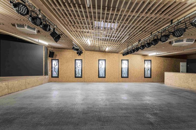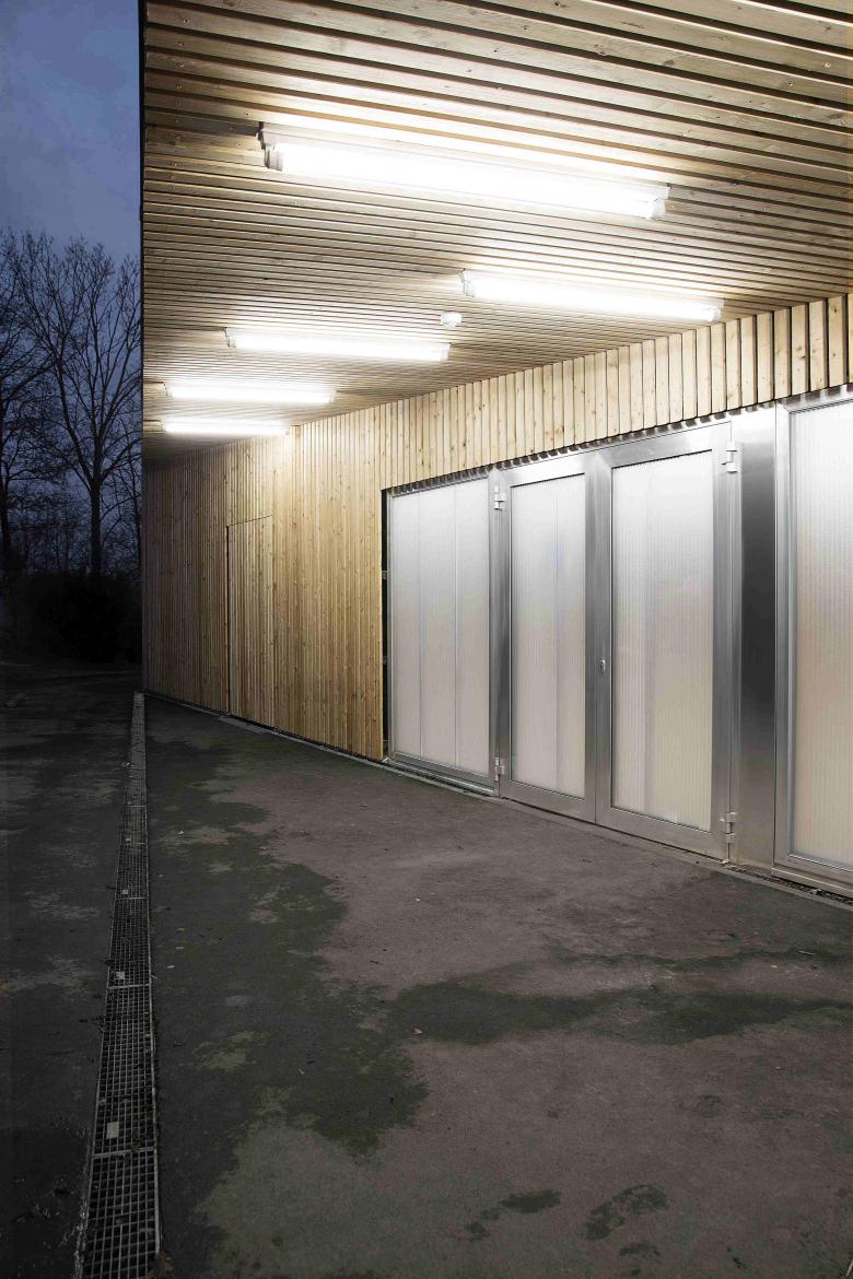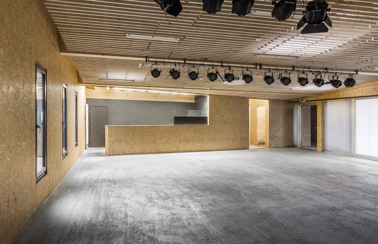 In bester Tradition des Hauptbaus von Peter Hübner entstand ein Ersatzbau für die marode Veranstaltungshalle des Jugendzentrums Zinsholz in Ostfildern. Der neue, klare Baukörper in Holzrahmenbauweise steht auf dem Bestandsfundament. Die Konstruktion beschränkt sich auf das Nötigste und entwickelt ihre Ästhetik aus dem offenen und naturgemäßen Einsatz der verwendeten Materialien: OSB und Lärchenlatten, blankes Aluminium und roher Estrich.