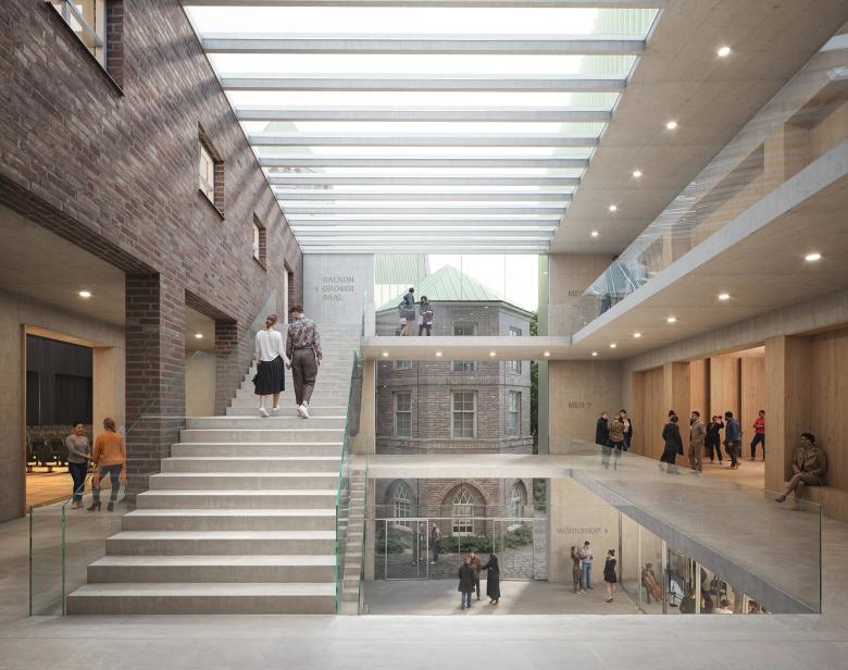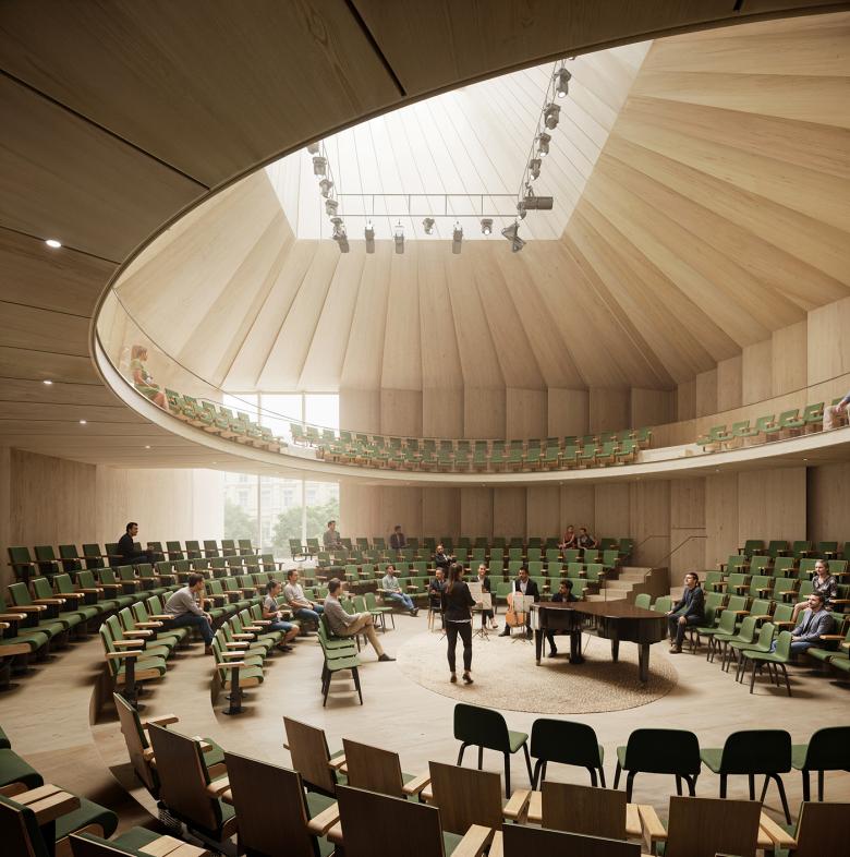 Das renommierte Konzerthaus „Die Glocke“ erweitert mit dem Neubau das Angebot musikalischer Erlebnisräume und festigt seine Stellung als kultureller Nukleus im Herzen der Stadt. Wir schlagen einen geometrisch klaren Baukörper vor, der über eine gläserne Fuge respektvoll an den historisch bedeutenden Altbau anschließt. Hier liegt auch das neue Eingangsfoyer. Zudem gibt es künftig optimale Bedingungen für die Durchführung von Workshops oder ähnlichen Veranstaltungsformaten. Weitere denkmalgeschützte Gebäude werden in das Ensemble integriert.