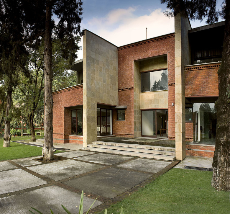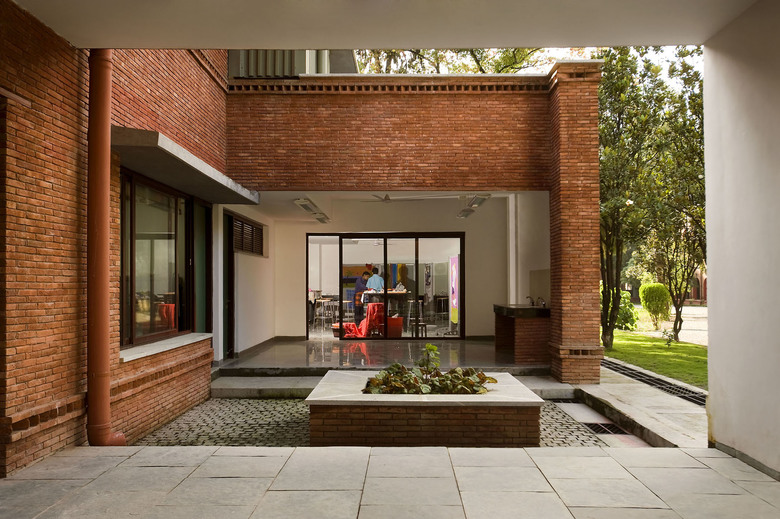 The building is contextual in terms of its orientation and materiality as it interfaces the iconic 100 year old English Renaissance inspired main school building and the rest of the brick architecture of the campus. It also blends seamlessly with the mature trees of the former Forest Research Institute of India. The east west orientation of the built form and landscape reinforces the direction of the old aqueduct and main building. The building massing is bold, contemporary and abstract. An exciting use of materials – Exposed brick tiles juxtaposed with olive coloured corrugated metal sheets and glass is set against an omnipresent spine of Yellow slate. Local stone is used generously in the courtyards and the internal flooring is predominantly grey kota stone – blending effortlessly with the lush natural surroundings yet being highly durable. The curved façades soften the corners of the building and are detailed finely with bands of brick-on-edge. The natural topography and foliage of the site is well preserved and negotiated, like the level difference between the building and the landscaped garden and existing trees are accommodated in the building design.