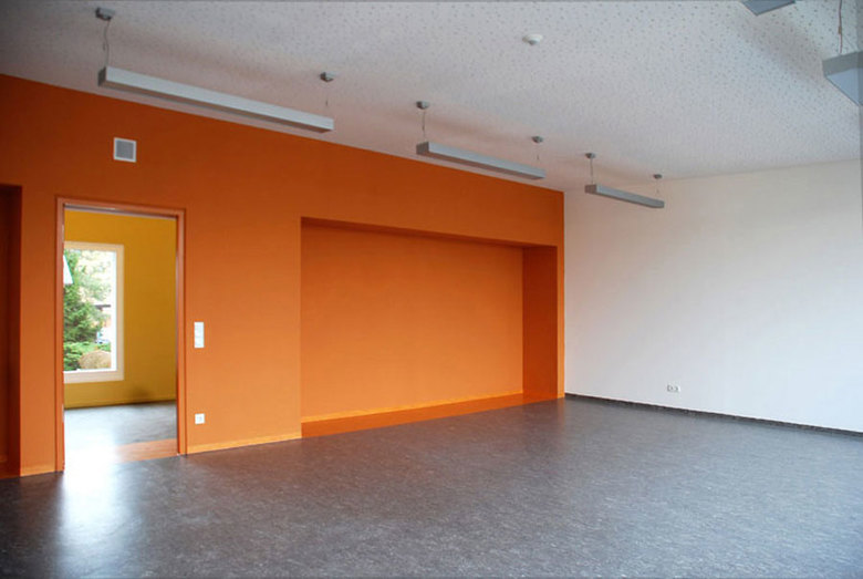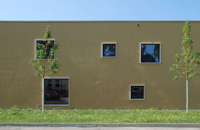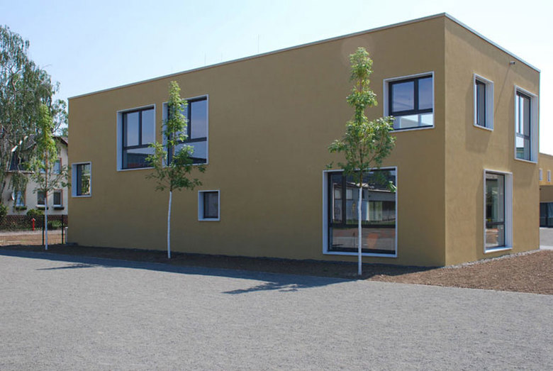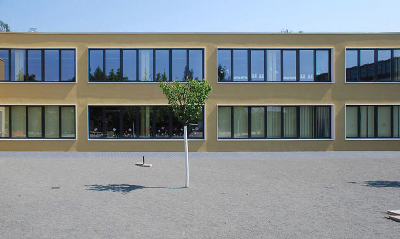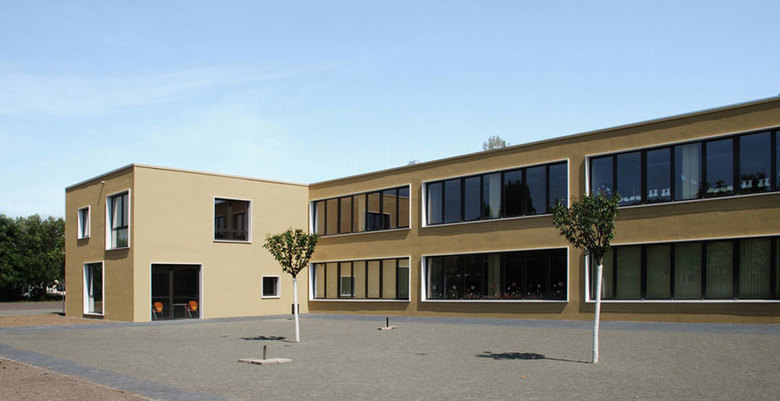 Der geometrisch einfache Baukörper weist großzügige Klassenraumfenster nach Süd- Westen auf, in den übrigen Bereichen zeigt in den Fassade spielerische Elemente, die in den Innenbereichen durch Heizkörpernischen, Leuchten, Pinnwände u.a. aufgegriffen werden und das spielerische Element einer Grundschule zur Geltung bringen.