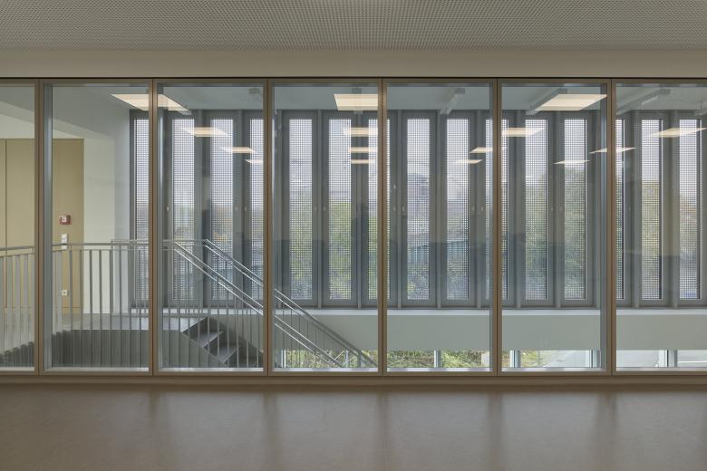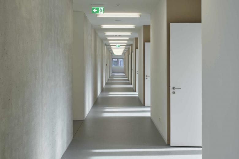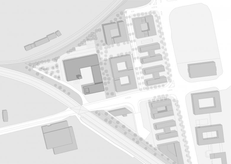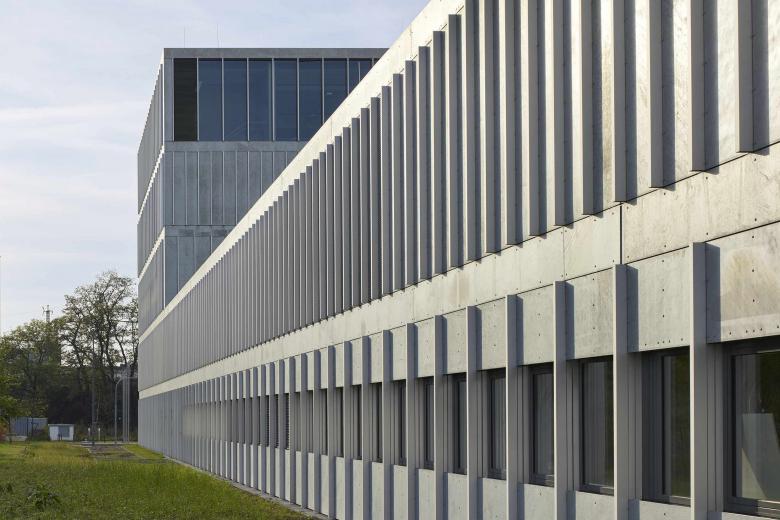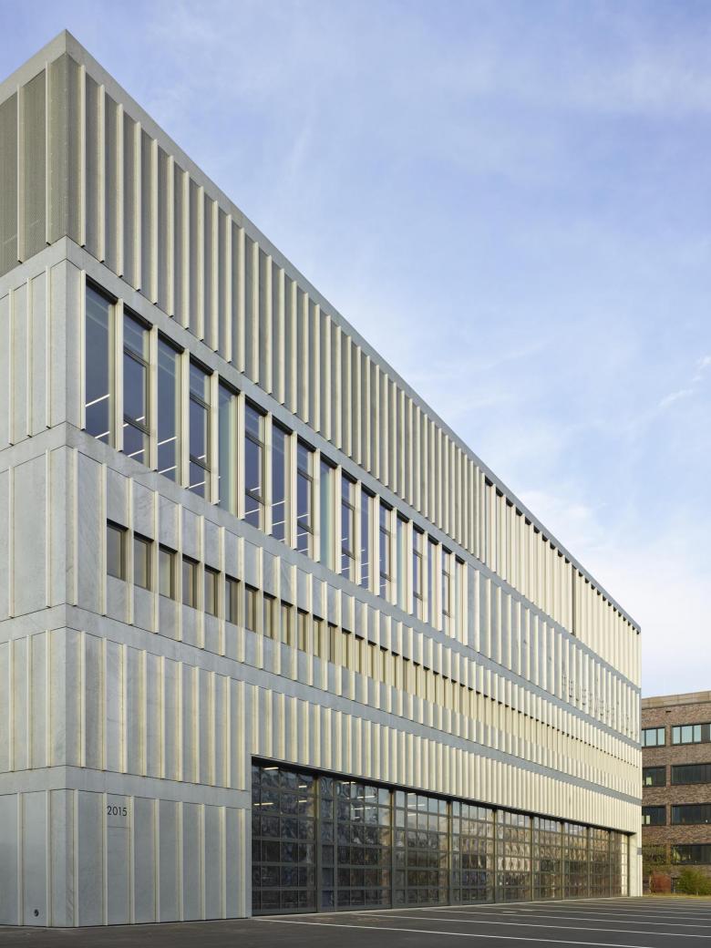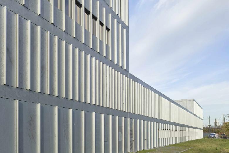 Gestaltungsziel ist der gestalterische Zusammenhalt des Ensembles durch die ruhige Anordnung strukturierter Fassaden und eine Gebäudekubatur, die sich gleichermaßen aus der Umgebung und aus der Funktionalität heraus entwickelt. Es entsteht ein räumlich – bauliches Kontinuum, das durch die horizontale Gliederung der differenziert reliefierten Metallfassaden wirkungsvoll inszeniert wird.