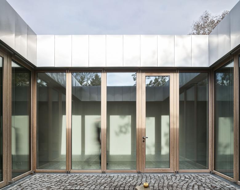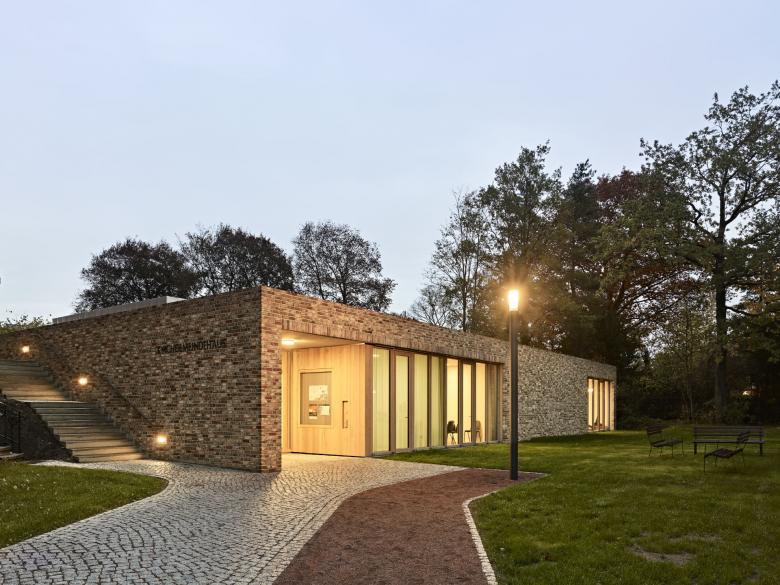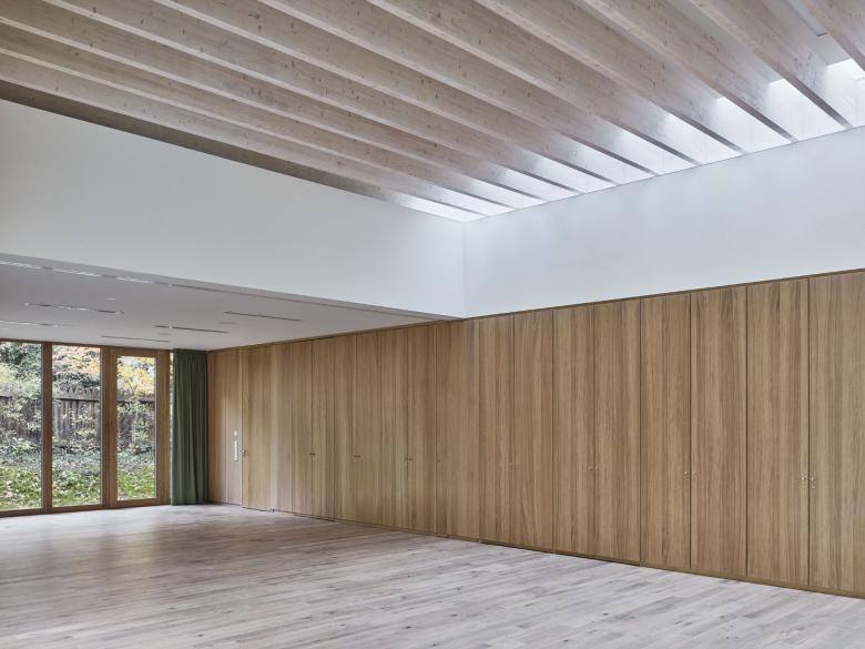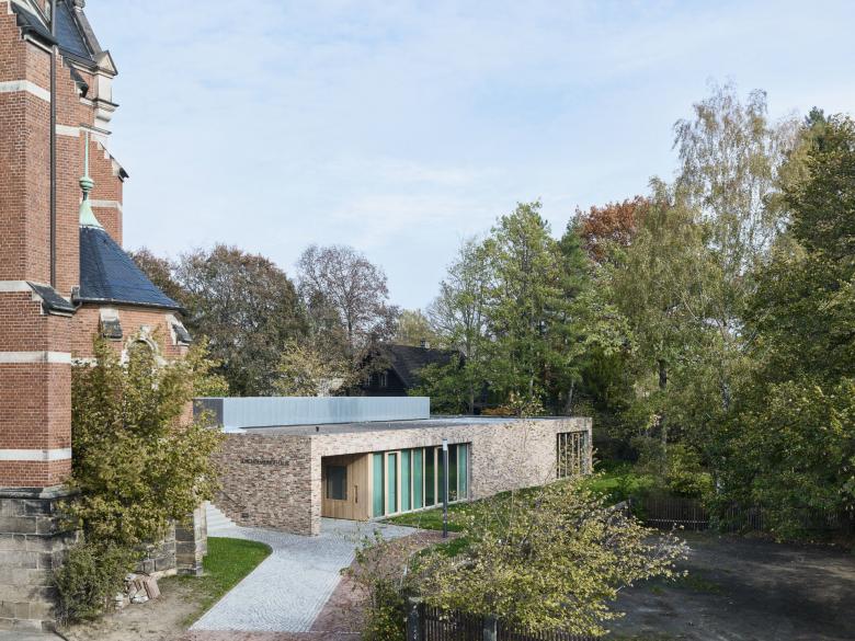 Das Foyer des Neubaus verbindet als Knotenpunkt die Innen- und Außenraumbezüge von Neubau und Bestand. Der Gemeindesaal und der angeschlossene Gemeinderaum werden über das zweiseitig zugängliche Foyer erschlossen und orientieren sich mit der Längsseite in den ruhigen Norden auf das Gartendenkmal des Ehrenhains. Die südlich davon gelegenen Räume orientieren sich auf einen umschlossenen Innenhof. Dieser Innenhof bildet eine besondere Charakteristik als Außenraum für ruhige Momente.