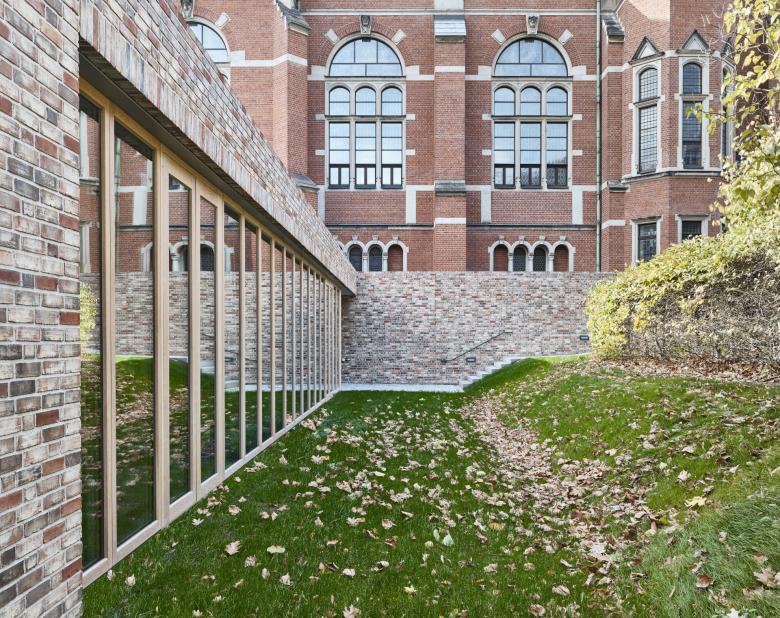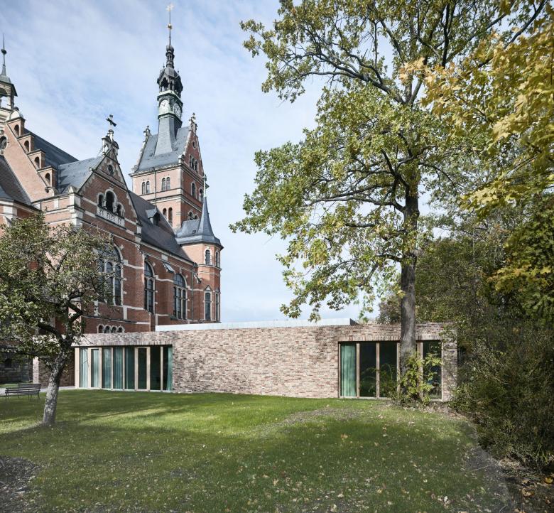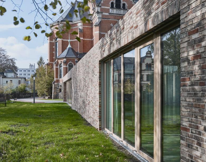 Die Außenwände werden mit Kerndämmung und Verblendmauerwerk versehen, dessen Farbmischung Bezüge zu den Steinfarben der Kirche aufnimmt. Dabei sollte der Neubau nicht die monochrome Ziegelfarbe der Kirche aufnehmen, sondern eine Mischung aus den Ziegelwänden und den Natursteinelementen des Sockels erzeugen. Realisiert wurde dies durch eine bewusst heterogene Mischung, deren rote Grundfärbung von vielerlei Farbabstufungen der Nachbarbebauung in unregelmäßiger Anordnung ergänzt wird.
