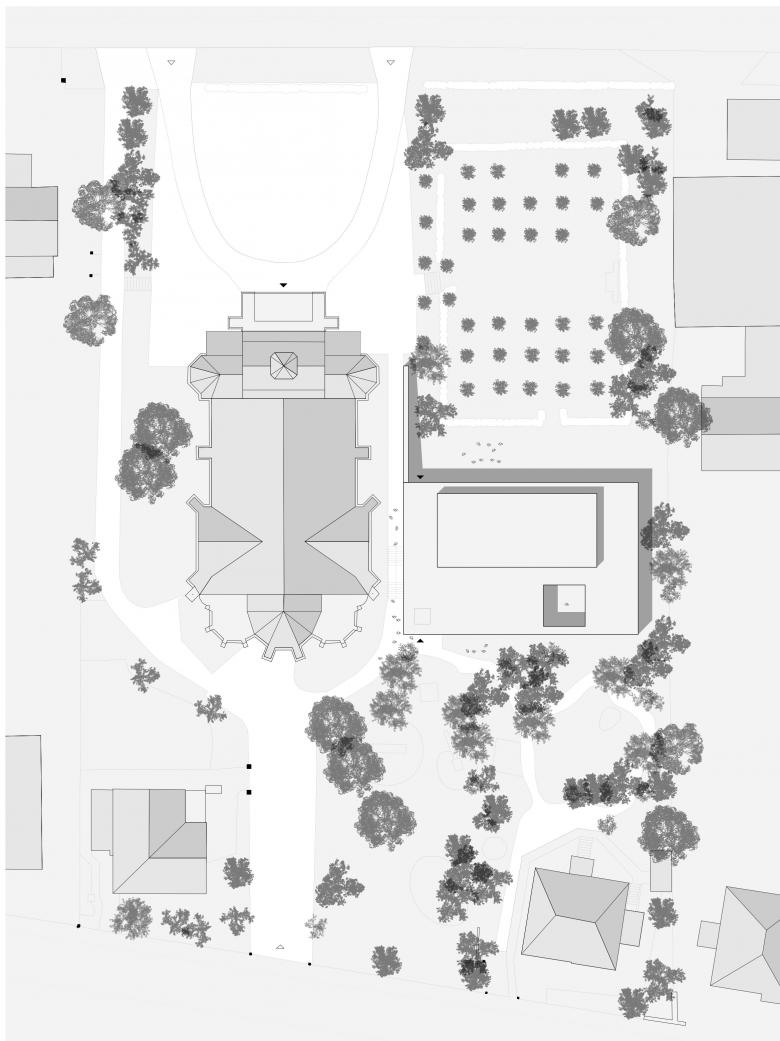 Die Anbindung des Kirchengebäudes erfolgt über einen Durchgang im Sockelgeschoss der Kirche, in der Kirche wird unter der Empore ein Treppen- und Liftaufgang mit einer Glasabtrennung eingebaut. Diese erdüberdeckte Anbindung fügt sich in die Erschließungs- und Funktionsstruktur des Gesamtensembles ein und erfüllt zudem die Forderung der Denkmalbehörden zum Erhalt des Rundweges um die Kirche.