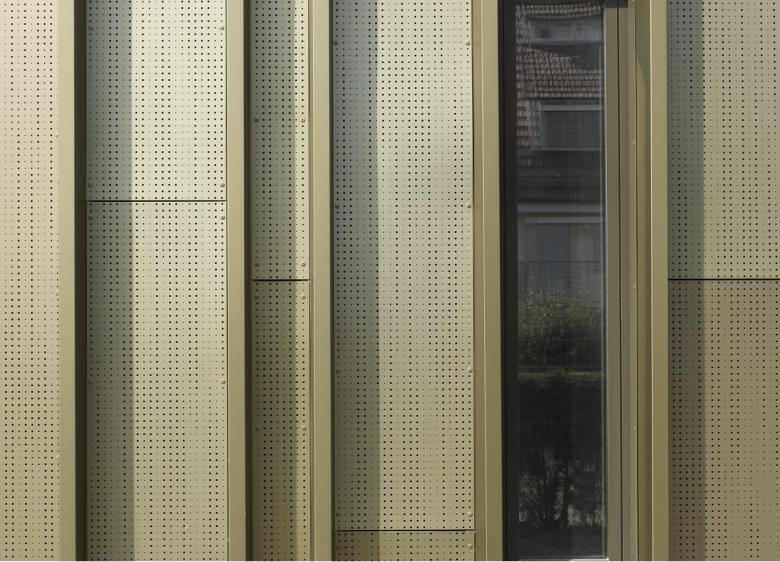 Die Höhe der Einzelbleche variiert in Abhängigkeit zu deren Breite. Die Aluminiumtafeln wurden mit versetzten Horizontalstößen verlegt und in verschiedenen Sättigungen eines Eloxalfarbtones verwendet. Die Metallflächen sind zusätzlich mit einer individuell geplanten Lochung aus vertikalen Lochreihen in verschiedenen Durchmessern versehen.