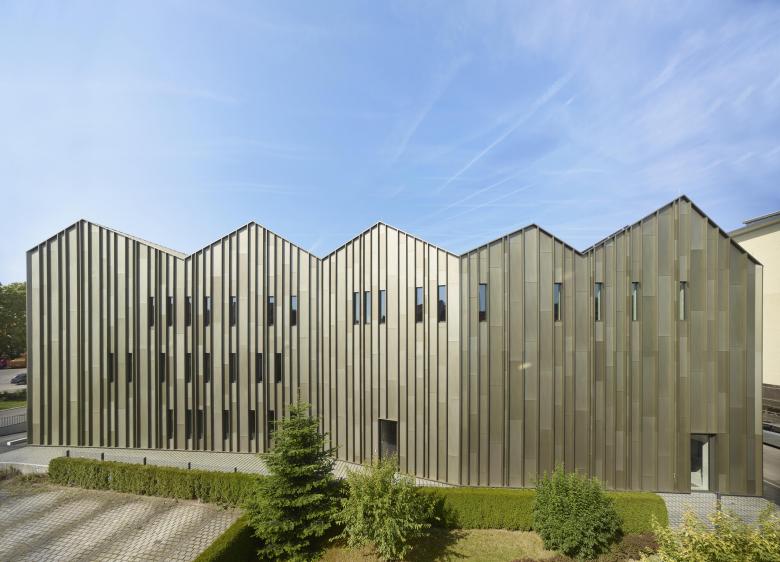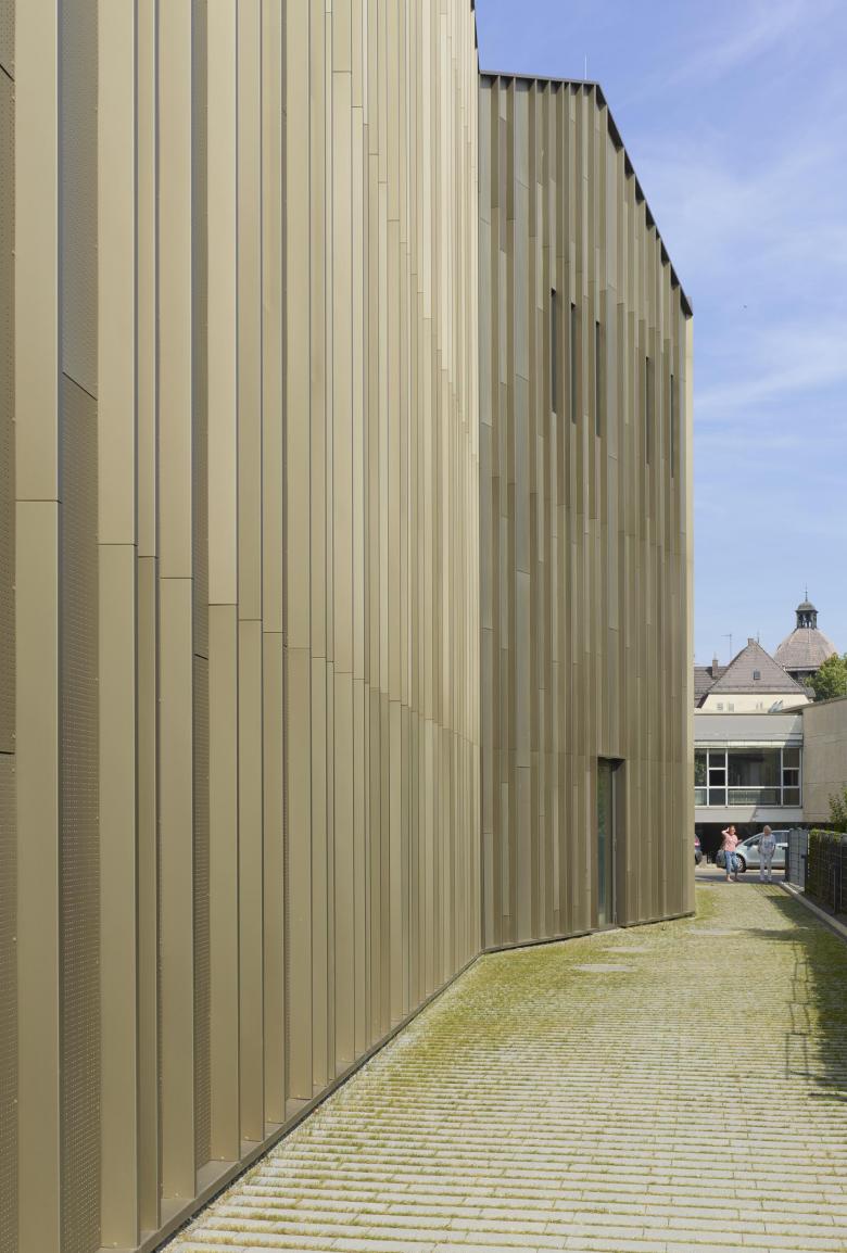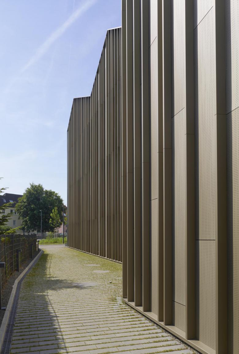FASSADEN – Gestalterisches Ziel war es, in der weitgehend geschlossenen Metallfassade eine kleinteilige Oberflächenstruktur zu erzeugen, die eine ungegliederte Flächigkeit konsequent vermeidet. Die hinterlüftete Fassade setzt sich daher aus Blechen zusammen, die in vertikalen Streifen unterschiedlicher Breite angeordnet sind und durch hervortretende Unterkonstruktionslisenen strukturiert werden. Dies erzeugt zusammen mit der geknickten Grundrisstruktur je nach Sonnenstand und Betrachtungswinkel unterschiedliche Tiefe.