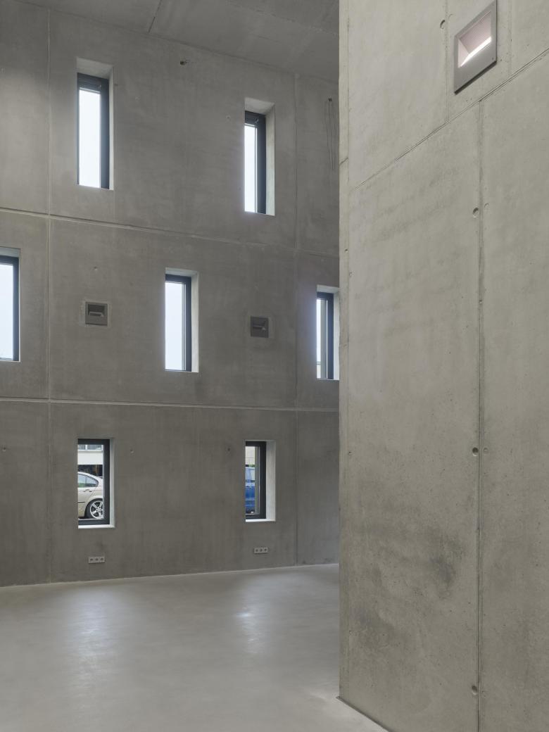 INNENRAUM - Der Innenraum stellt sich durch Decken und Wände in Sichtbetonqualität als veredelter Rohbau dar, der Ausbau reduziert sich im wesentlichen auf geschliffenen Estrich mit Silikatimprägnierung, Stahltüren und eine sichtbar verlegte Grundinstallation für die technischen Versuchsflächen.