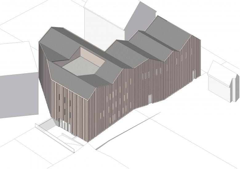 Die Grundrissform stellt sich als unregelmäßiges Polygon dar, dass sich hauptsächlich an der Grundstückssituation orientiert und sich optimal in die Baulücke einfügt. Analog zu seiner geknickten Grundrisskontur ist die Dachform ausgebildet. Durch die Addition von Satteldächern und die traufständige Anordnung entsteht eine angemessene Kleinteiligkeit, da das Tageslicht an den unterschiedliche geneigten Flächen unterschiedlich reflektiert wird und sich somit unterschiedlich helle Fassadenbereiche abbilden. Durch die gewählte Baukörpergliederung fügt sich das Gebäude maßstäblich in das Stadtbild und die zum Teil mittelalterliche Baustruktur ein.