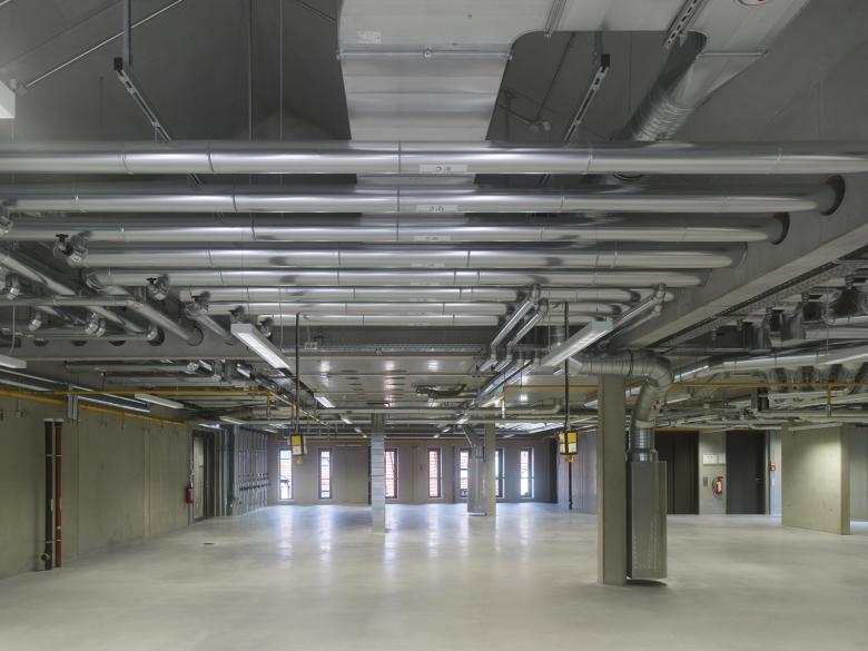 Die wenigen Ausbaumaterialien wie Geländer, Handläufe, Türblätter und Zargen sind in Edelstahloberflächen gehalten oder in abgestuften Grautönen beschichtet. Der dadurch entstehende monochrome Raumeindruck bietet einen angemessen zurückhaltenden Rahmen für die individuelle Ausstattung durch die jeweiligen Versuchsanlagen.