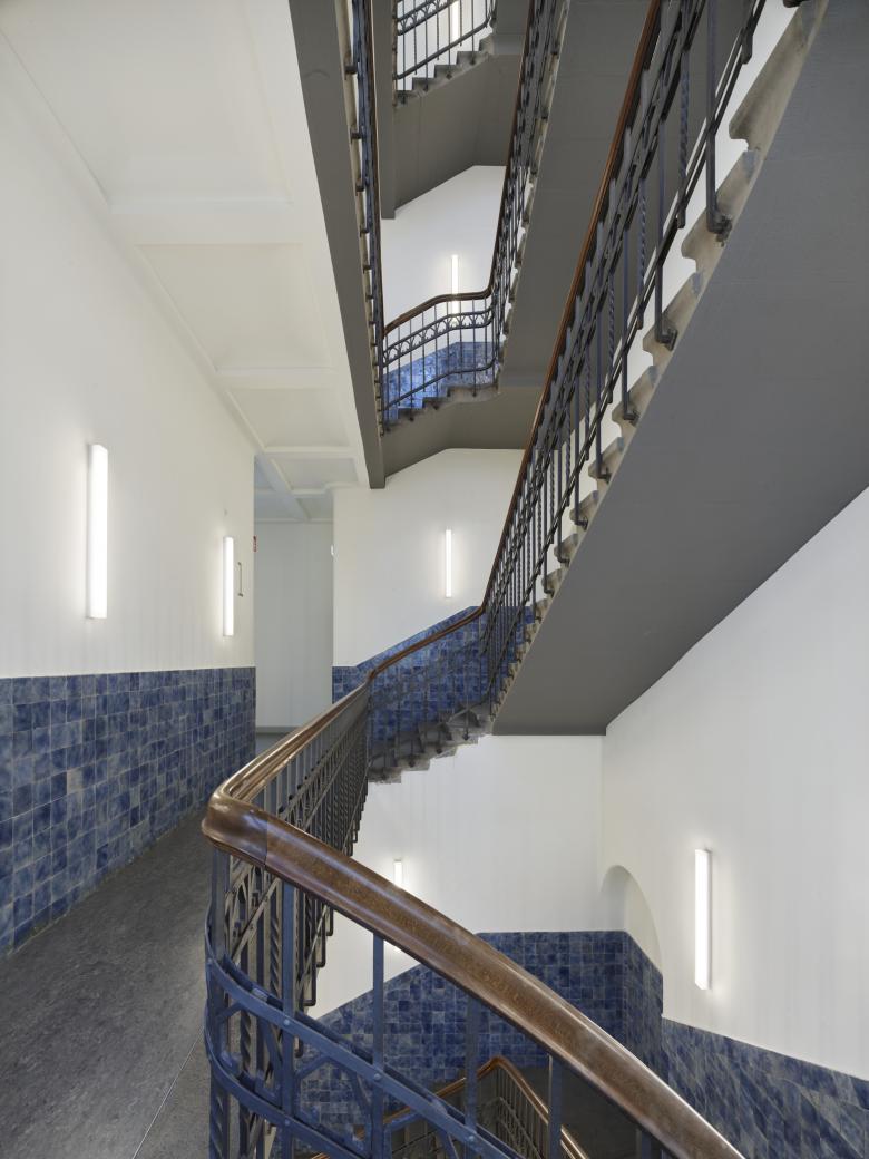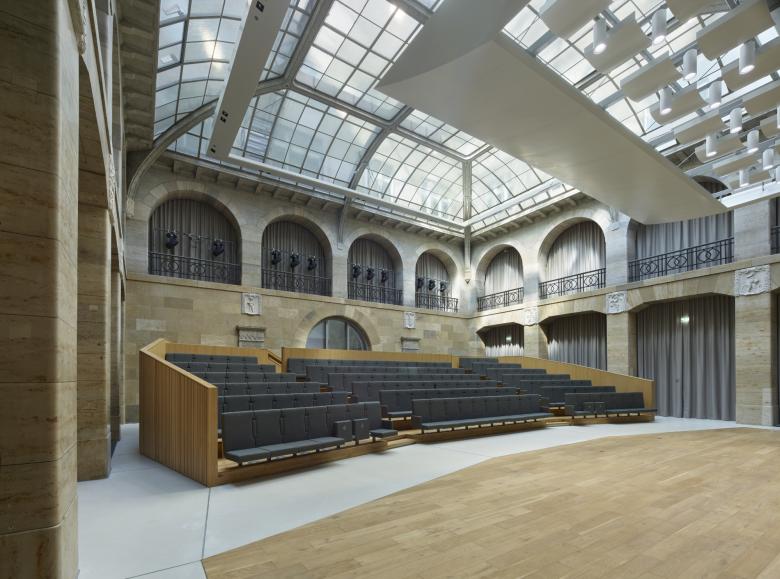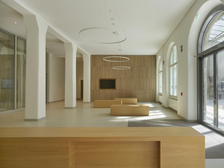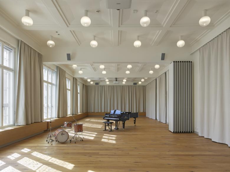 Das Herzstück des Komplexes bildet jedoch die historische Schalterhalle im Erdgeschoss, die als neuer Kammermusiksaal eine repräsentative Nutzung erhält. Aus unterschiedlichen Gebäudeteilen werden Einblicke in den Saal ermöglicht, sodass sich die musikalische Nutzung immer wieder im Gebäude abzeichnet. Ein eigenes Besucherfoyer ermöglicht dessen öffentliche Nutzung unabhängig des restlichen Gebäudebetriebs.