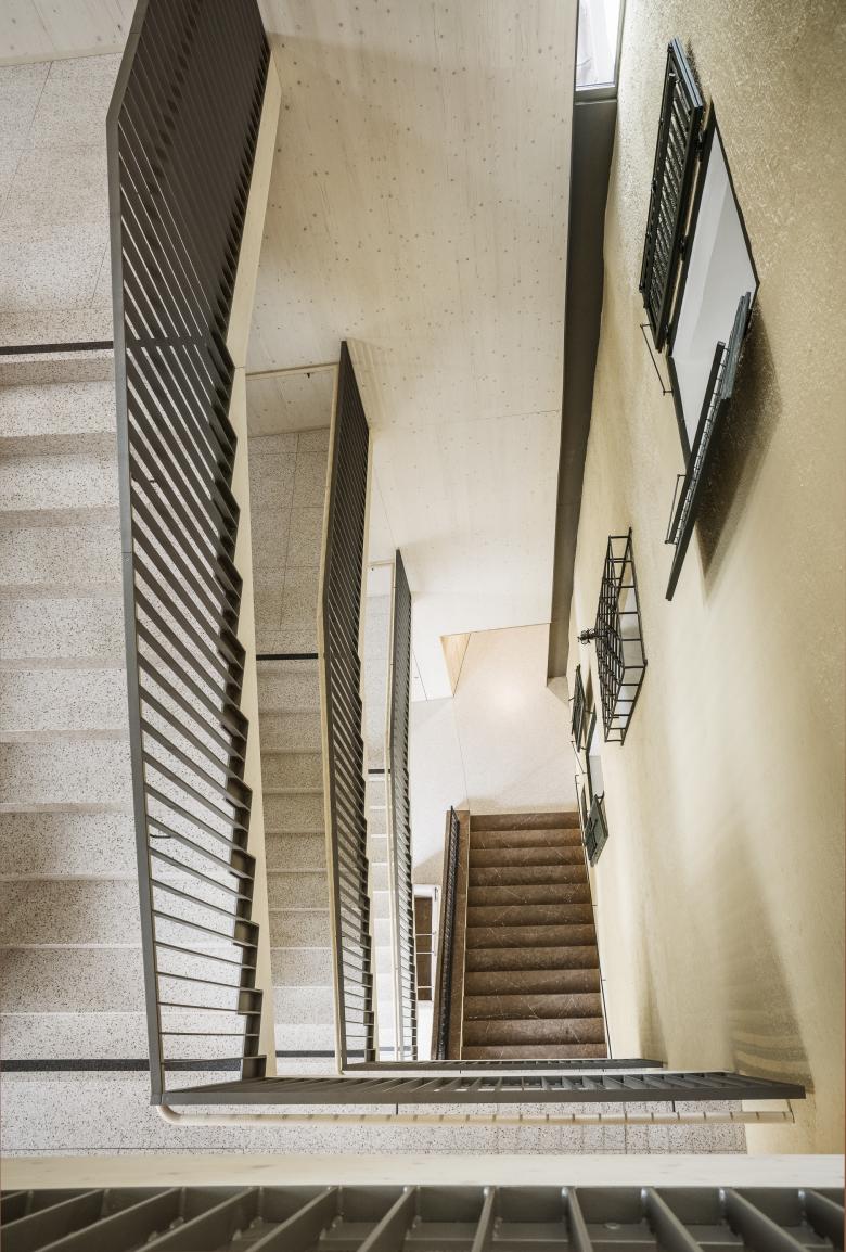 Die Südfassade des Hauptturms wurde um eine Raumschicht erweitert, die sich elegant an den Bestand anschmiegt und ein Spannungsfeld zwischen historischer Substanz und zeitgenössischer Architektur aufspannt.