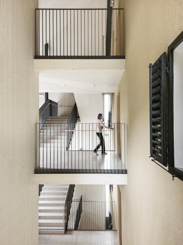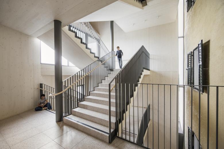 Der ursprüngliche Gedanke eines Funktionsbaus, der einen zweiten Fluchtweg und einen Lift beinhaltet wurde im Entwurfsprozess um Nutzungen für den Schulbetrieb ergänzt.