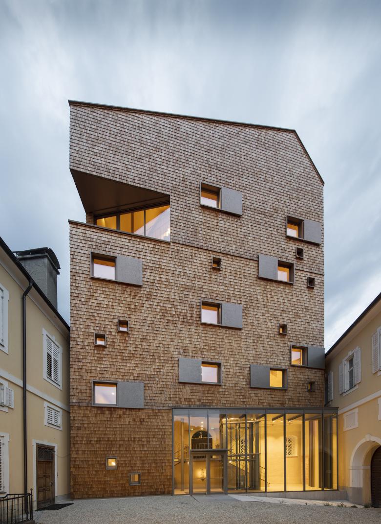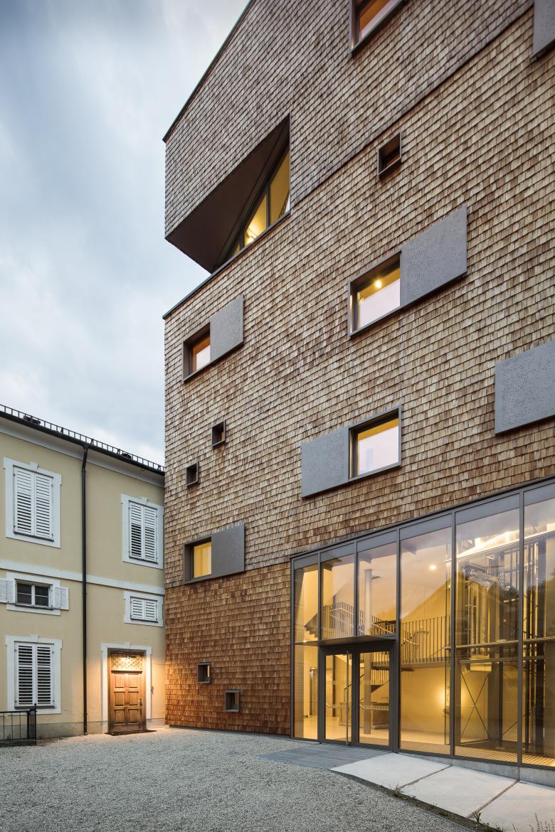 Die atmosphärische Qualität von Holz zeichnet den Anbau aus und verleiht beim Betreten ein Gefühl von Wärme. Die geschindelte Fassade ist kein neues Material im Kontext, sondern wurde auch bereits beim Dach des Schlossturms eingesetzt. Zwei großzügige Öffnungen im Volumen ermöglichen den Eingang, bzw. Rahmen den Ausblich in die Salzburger Kulturlandschaft. Im Kontrast dazu stehen die kleineren Fenster mit ihren Schiebeläden, ebenfalls ein Motiv, dass im Schlossensemble allgegenwärtig ist.