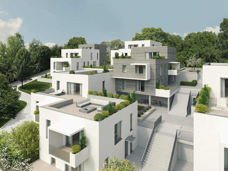 Die besondere Lage des Grundstückes (Ausrichtung n. Westen) im Landschaftsraum, sowie die Hangtopografie erfordern einen besonderen städtebaulichen Ansatz. Die Antwort darauf fanden wir in einer kleingliedrigen, dörflichen Struktur und in weiterer Folge die daraus resultierende, angenehme Maßstäblichkeit von 2- bis 3-geschoßigen Baukörpern.