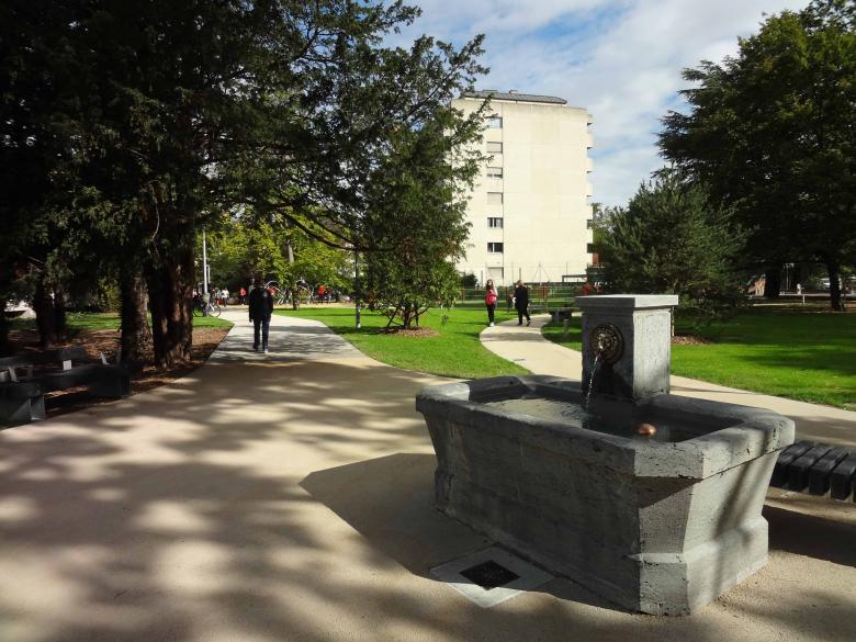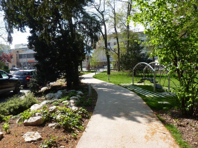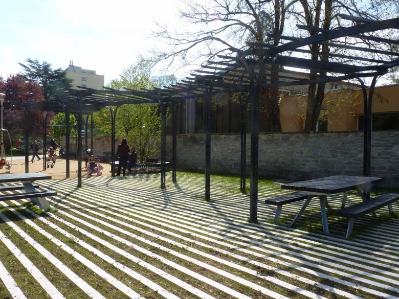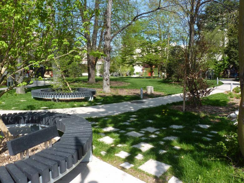 Les cheminements sont requalifiés, la végétation existante valorisée et complétée. Un nouveau concept d'éclairage ainsi q'une réflexion sur le mobilier urbain sont proposés dans un aménagement intergénérationnel.