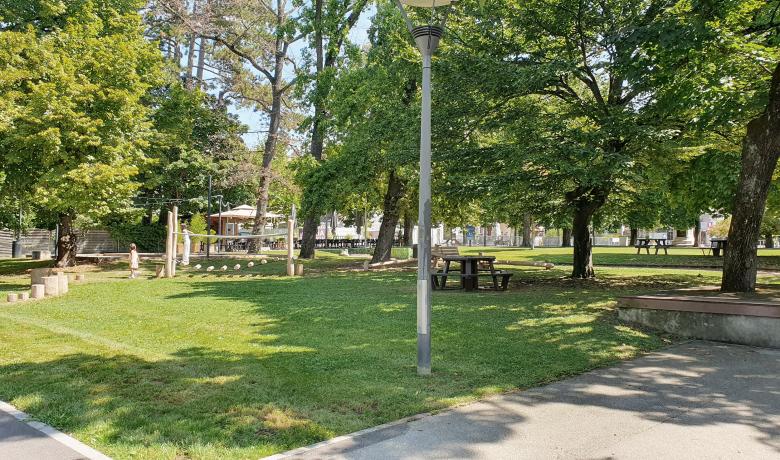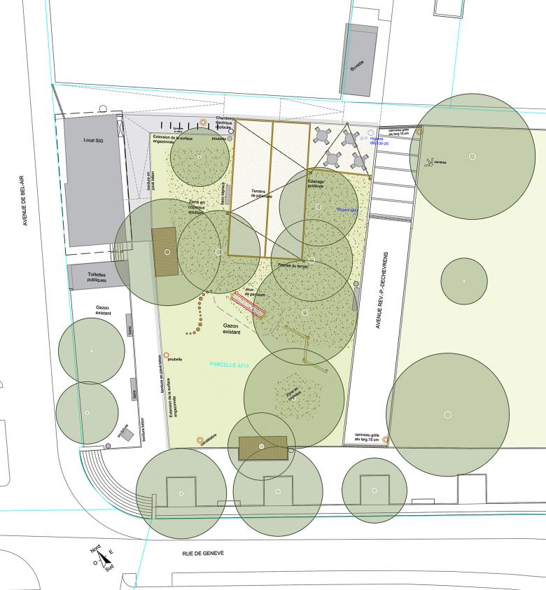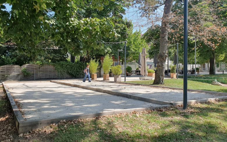 L’espace de projet comprend des arbres majeurs sous lequel sont projetés les terrains de pétanque. Un soin particulier sera apporté pour les travaux sous l’emprise des arbres, les terrains de pétanque seront posé en positif sur le terrain, les jeux proposés présents dans le domaine vital des arbres seront sans fondation et par conséquent n’impactera pas le système racinaire existant.