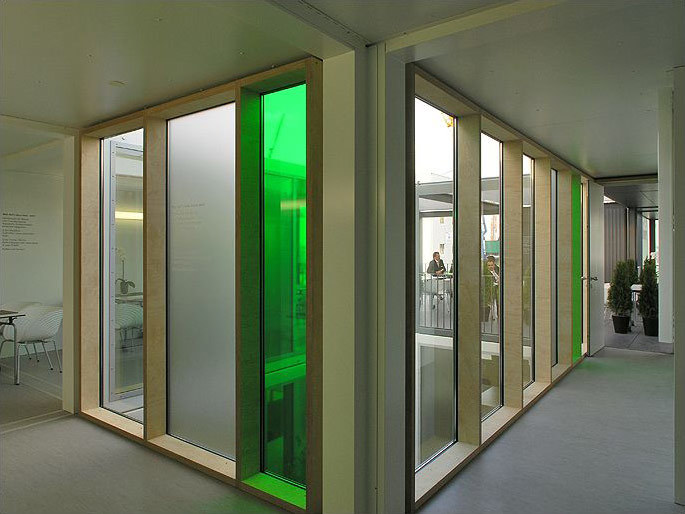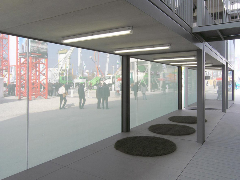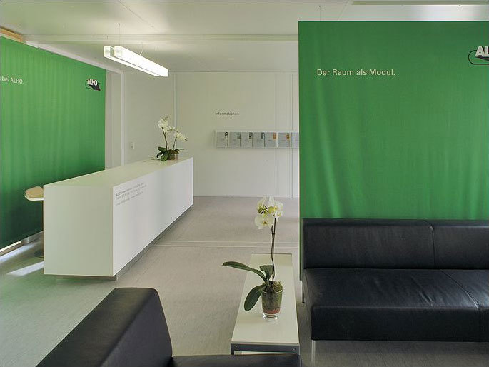 Sichtbezüge zwischen den den einzelnen Funktionsbereichen und Geschossen weckten Neugier und schafften veränderte Perspektiven auf gerade erlebte Räume. Dem Baukörper vorgelagert war ein dreigeschossiger Container-Treppenturm. Verhüllt mit einem Tuch in den Farben der Firma, diente er als weithin sichtbares Werbeelement. Der sich ausbildende Raum empfing den Messebesucher, Bänke luden zum Sitzen ein. Ein in die diagonal gegenüberliegende Ecke eingeschobener grüner Turm wiederholte die werbewirksame Geste.