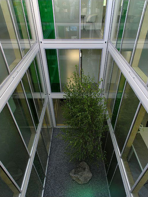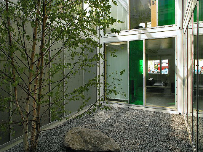 Abweichend von den üblichen Kunststoffenstern und Trapezblechen wurden die Fassaden im Bereich des Patios mit einer vollflächig verglasten Pfosten-Riegel-Konstuktion aus 50 mm starken Multiplex-Platten versehen. Durch den Patio drang das Licht tief in das Innere des Gebäudes ein.