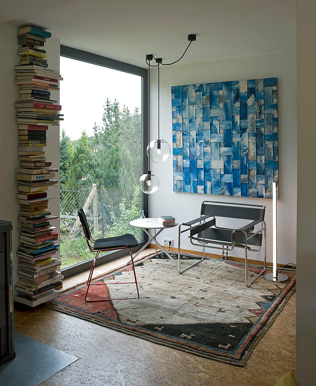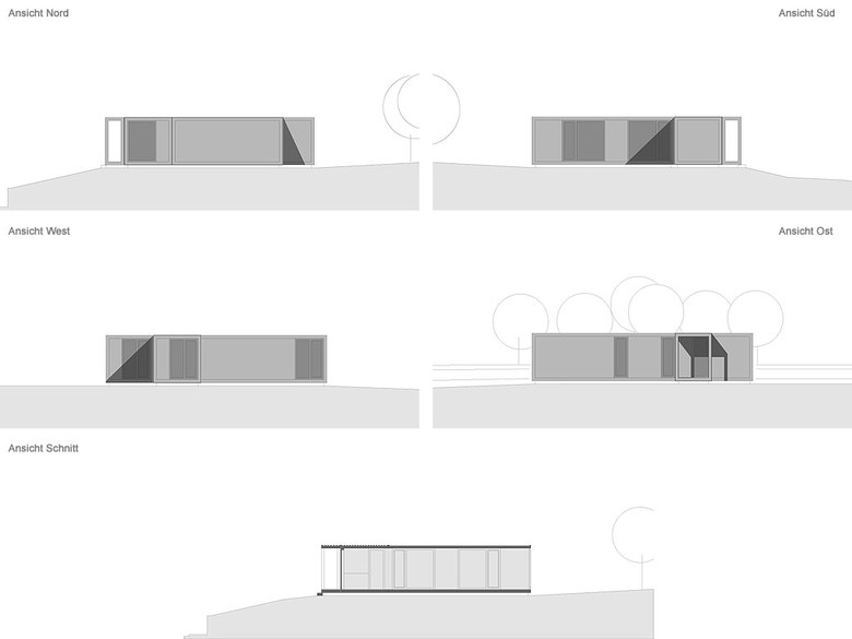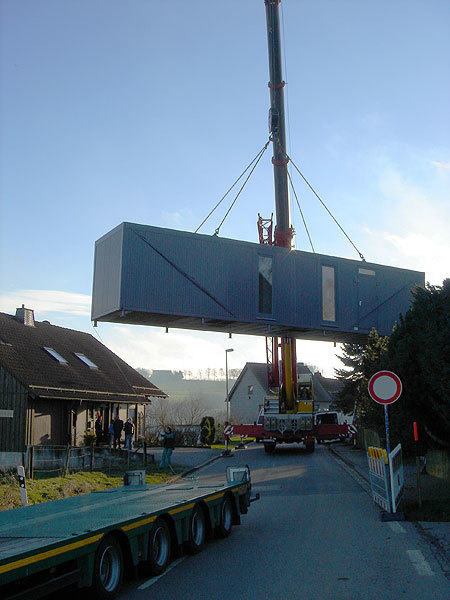 In der idyllischen Ortschaft Kall, auf einem leicht nach Süden geneigten Grundstück, entstand der Wunsch der Bauherren nach einem Haus aus Containern. In einer von Kuhweiden, Wäldern und Satteldächern geprägten Umgebung, faszinierte der Gedanke, ein Gebäude dort nur „ankern“ zu lassen. Ein Vorgängerbüro bearbeitete das Projekt bis zur Genehmigungsplanung bevor wir mit der Aufgabe konfrontiert wurden, diese zu überarbeiten und zu realisieren. Wir optimierten Grundriss und Container-Konstellation, änderten Fassaden und definierten Oberflächen. Nach Detailplanung und vierwöchiger Produktion wurden die „Kisten“ angeliefert und montiert. Lediglich im Bereich des Containerstoßes wurden Decke, Wand und Boden vor Ort angearbeitet, sowie Ver- und Entsorgung angeschlossen. Alles Weitere war schon im Werk vorfabriziert und eingebaut, das Haus somit am selben Tag bezugsfertig. Anfängliche Verwunderung seitens der Nachbarn, über das plötzliche Erscheinen eines neuen Hauses, ist inzwischen positiver Resonanz gewichen. Die überraschende Großzügigkeit im innern des Hauses, wird ebenso bestaunt wie der geschützte Sitzplatz auf der Terrasse hinter dem Haus. Allerdings wird nach wie vor die Frage gestellt, wann die Bauherren wieder Geld zusammenhaben … für das Dach. ; )