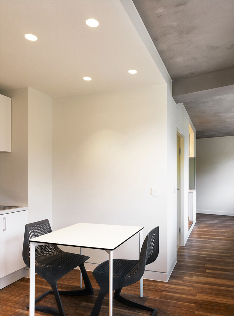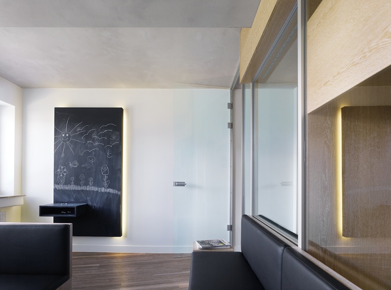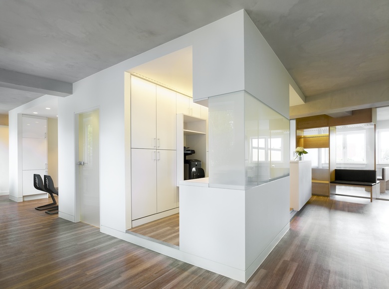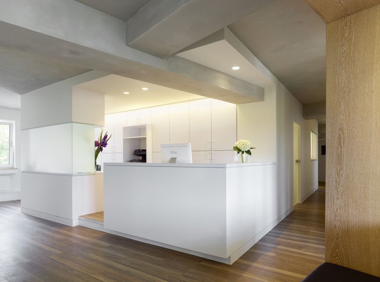 Die 150 qm große bestehende Zahnarztpraxis entsprach sowohl räumlich als auch materialtechnisch nicht mehr den heutigen Anforderungen. Innerhalb von drei Wochen (Praxisurlaub) sollte der Umbau realisiert werden. Auf Grund der zeitlichen Restriktion wurde das Projekt in zwei Schritte unterteilt. Im ersten Schritt wurde der Empfangsbereich, das Wartezimmer, die sanitären Einrichtungen, die Teeküche und der Sterisilationsraum umgebaut. In einem weiteren Schritt werden die Behandlungsräume, das Labor und der Röntgenraum den heutigen Anforderungen angepasst. Die Stahlbeton-Konstruktion des Gebäudes lässt eine hohe Flexibilität der Grundrissgestaltung zu. Diese Freiheit wurde zum Konzept erhoben und alle nicht tragenden Wände abgebrochen. In den Gesprächen mit dem Arzt und dem Praxisteam kristallisierte sich der Wunsch nach einer großen Transparenz bei gleichzeitiger, möglicher Intimität heraus. So wurde ein Kern etabliert, welcher blockhaft in den freien, loftartigen Raum gestellt wurde und von den Verkehrsflächen umspült wird. Dieser Block nimmt die Räume Empfang, Back Office, Personal-Umkleide, Personal-WC, Teeküche, Sterisialtionsraum und Patienten-WC auf. Die Räume Flur, Empfang, Personalbereich fließen ineinander über, es wird keine massive Grenze gesetzt. Das Wartezimmer wurde räumlich an derselben Stelle belassen, wird allerdings nicht mehr durch eine massive Wand geschlossen. Eine raumhohe Glastrennwand mit integriertem Garderobenmöbel lässt eine hohe Transparenz zu und bietet einen Schallschutz. Das Farbkonzept entspricht der reduzierten Formensprache. Der Stahlbeton der Decke wurde wieder hergestellt und zu einem Sichtbeton veredelt. Alle Wände sind glatt gespachtelt und reinweiß gestrichen und bilden somit einen spannenden Kontrast. Der Boden ist ein Vinyl-Belag, in Holzoptik (gekälkte Eiche) gehalten. Dieser fließt in alle Räume und bildet eine "warme" Basis. Sämtliche Möbel sind individuell angefertigt. Die Schränke des Kerns sind mit weissen Schichtstoffplatten und die Möbel des Wartezimmers mit gekälkter Eiche belegt. In den WC-Räumen finden die Patienten in den Wandfliesen das Rot des Praxis-Logos als subtilen "Anker" wieder. Das Lichtkonzept folgt dem Entwurf in konsequenter Weise. So wurde auf jegliche Leuchte in den Verkehrsflächen verzichtet. Der eingestellte Block dient als Lampenschirm und leuchtet die Gänge atmosphärisch aus.