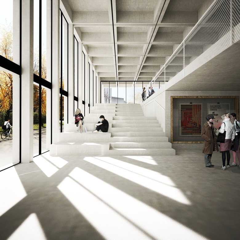 Der öffentliche Horizont mit der Aula als öffentliche Schlüsselnutzung bei der Haltestelle der Limmattalbahn, vermittelt zwischen der Ebene des Sportplatzes und der Ebene des höher gelegenen Pausenplatzes vor der Mensa. Der Eingang der Aula ist somit auf Ebene Haltestelle (Ebene EG) im Norden, und der Eingang der Schule auf dem Niveau des Pausenplatzes im Süden (Ebene 1.OG). Bei Schulbeginn und -Ende, sowie bei öffentlichen Veranstaltungen, ist der nördliche Eingang frequentiert. Während der Unterrichtszeit konzentriert sich die Zirkulation auf die Pausenplatzebene mit Anbindung an die bestehende Schule. Die beiden Zugangsebenen verbinden sich im Inneren über ein variabel bespielbares, zweigeschossiges Foyer und eine grosszügige Treppenanlage mit Sitzstufen.
