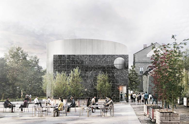 Das neue Konzerthaus für die Kuppel knüpft an die Geschichte und die Spuren des Ortes im Nachtigallenwäldeli an. Die entwerferische Herangehensweise versteht die Stadt als gewachsene, heterogene Struktur mit identitätsstiftenden Spuren. Vorgefundene Elemente werden aufgenommen, adaptiert und weiterentwickelt. Nach aussen tritt das neue Konzerthaus als Gebäude in verzinktem Stahl und Marmor in Erscheinung. Die Dualität der beiden Materialien Metall und Stein definiert zwei Gebäudekörper mit jeweils spezifischen Nutzungen. Das metallische, runde Volumen beinhaltet sämtliche musikalische Nutzungen, wie den Konzertsaal und die Bandproberäume. Der haptische, murale Körper beinhaltet sämtliche dienende Nutzungen. Die beiden Gebäudekörper bedingen und ergänzen sich folglich. Als drittes Element der Komposition ist die Anzeigetafel als Dachaufbau positioniert. Zusammen bilden die einzelnen Gebäudefragmente eine sich bedingende Einheit, ein neues Ganzes. Die Vielfältigkeit der Musikrichtungen und Veranstaltungen soll sich in der architektonischen Gestaltung und der Formgebung der Neuen Kuppel wiederfinden.