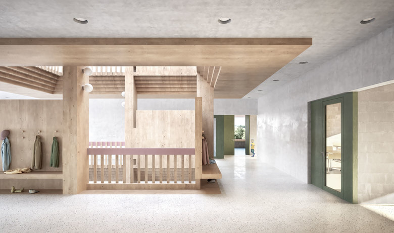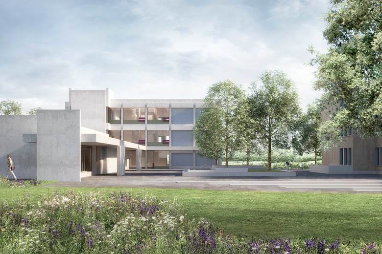 Das neue Haus setzt sich aus drei Volumen zusammen, welche von einem einladenden Vordach zusammengehalten werden. Den Auftakt im Norden bildet ein eingeschossiger, in die Länge entwickelter Gebäudeteil, der den Hort und Mehrzweckraum beherbergt. Dem Baukörper vorgelagert und somit den Pausenplatz begleitend, verläuft ein grosszügiges Vordach. Es holt die Kinder im nördlichen Bereich des Geländes ab und führt sie entlang der Fassade zum Haupteingang des zurückversetzten neuen dreigeschossigen Schulgebäudes mit den Klassen- und Therapiezimmern. Erschlossen werden die einzelnen Geschosse über einen an den Lichthof angrenzenden Erschliessungskern mit Treppen- und Liftanlage. Als Scharnier der Gebäudekonglomeration befindet er sich im Berührungspunkt der beiden Nutzungsbereiche und tritt als weiteres Volumen in Erscheinung. Während die einzelnen Baukörper deutlich auszumachen sind, fügen sie sich doch zu einem Ganzen und treten mit ihrer Volumetrie in einen vorsichtigen Dialog mit den Bestandesgebäuden.