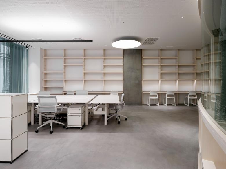 Die Gestaltung eines fliessenden und dynamischen Raumes erlaubt es den Arbeits- und Veranstaltungsbereich räumlich von einander zu trennen und sie gleichzeitig visuell miteinander zu verbinden. Innere Verglasungen verleihen dem Raum die gewünschte Offenheit und Transparenz und lassen Tageslicht bis tief in den Raum fliessen. Die Materialisierung der Volumen in hellem Holz bildet einen Kontrast zum rohen Zustand der Decke und wird durch textile Oberflächen im Arbeitsbereich, welche für Wärme und Behaglichkeit sorgen, ergänzt.