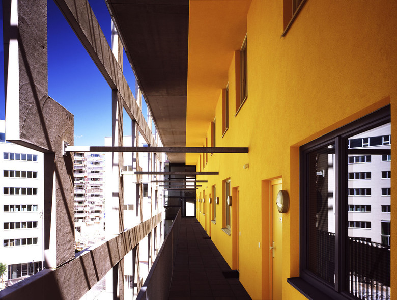 Die ungewöhnliche Widmung des Bebauungsplans erlaubt uns eine ungewöhnliche Form: Indem wir 24 Maisonetten stapeln und versetzen schaffen wir einen Terrassenhaustypus, der mit seiner geneigten Fassade die Sonne best möglich herein lässt. Positiver Sideeffekt der Gestaltung: jede Wohnung hat Querlüftung. Zum Platz hin zeigen wir eine markante Fassade mit Laubengangerschließung - die Bewohner haben Ausblick auf den öffentlichen Platz, inspiriert durch das Shakespearsche Hoftheater. Die Bewohner erzählten uns beim abschließenden Grillfest wie schön es ist im Kabelwerk zu wohnen - unser schönstes Kompliment!