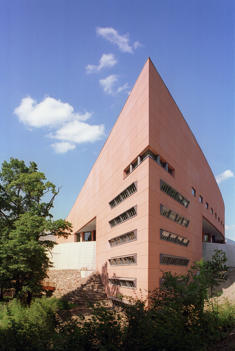A glass gallery with vaguely semi-circular sections leads visitors into the pavilion and the exterior covering of coloured cement defines the façades.