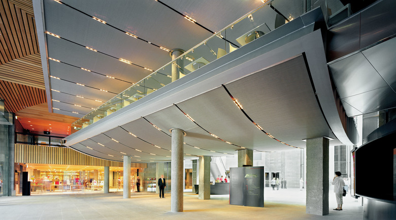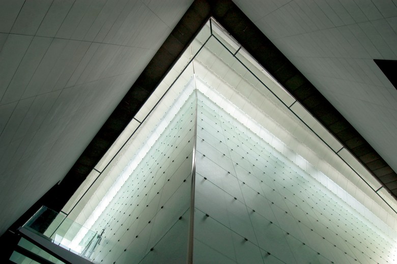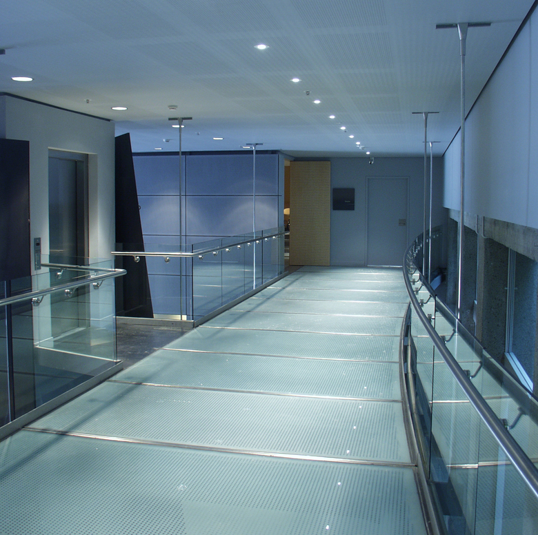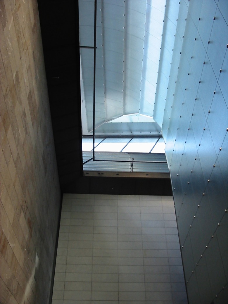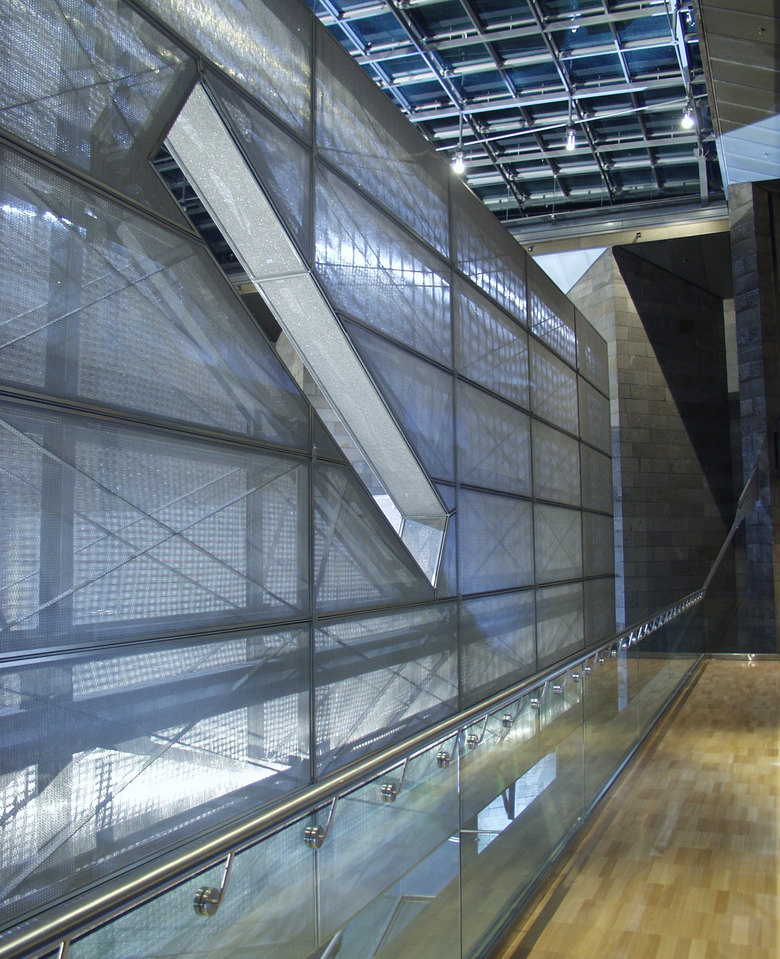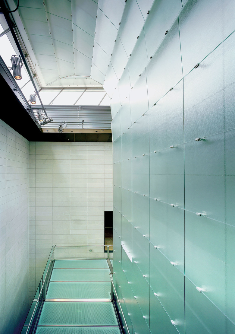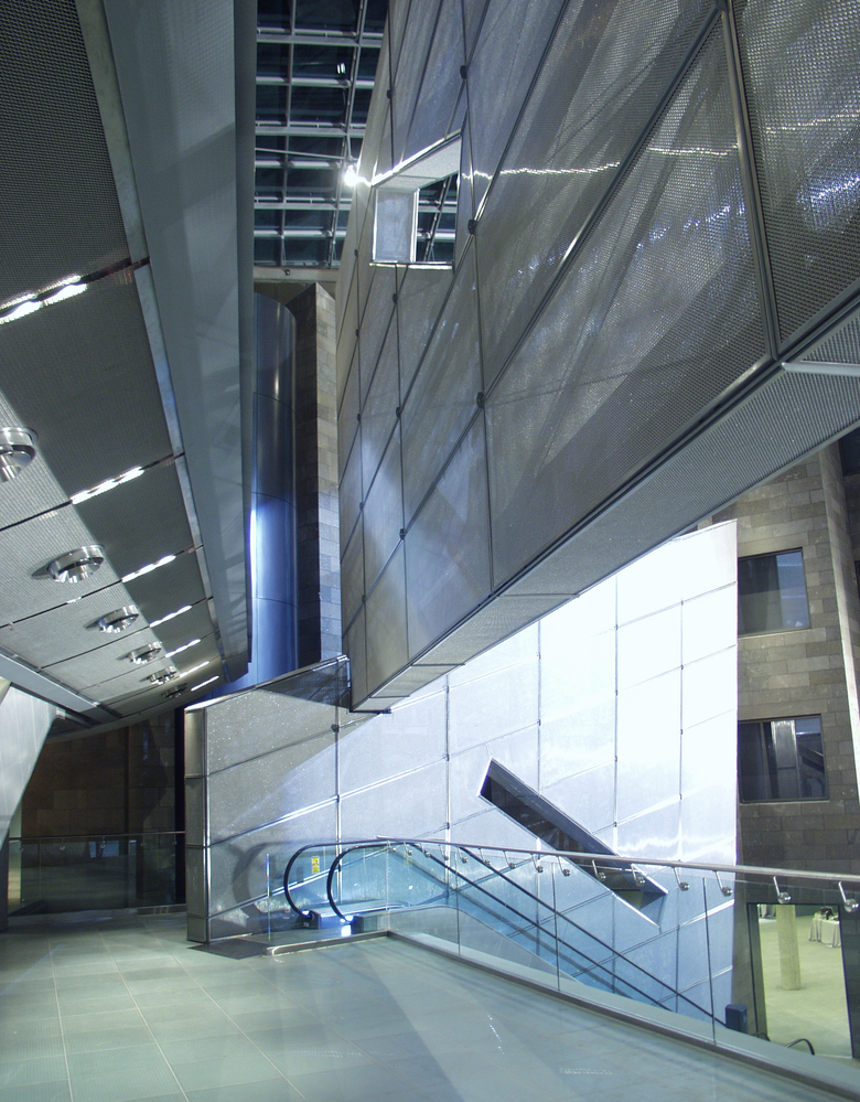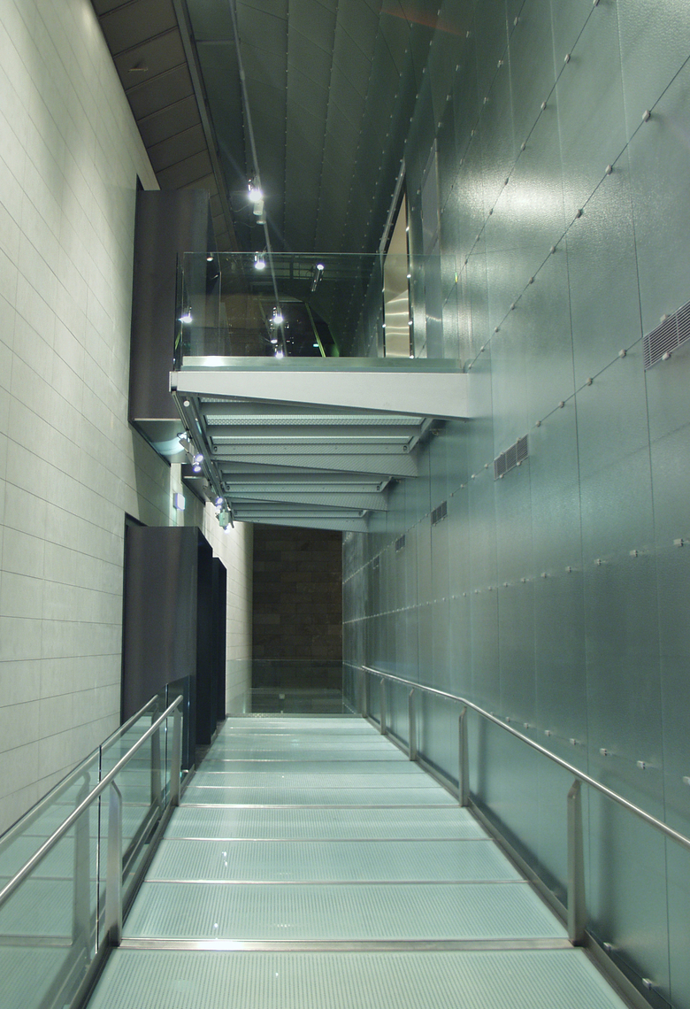 A network of angled winds, in very light hi-tech materials, partially invades the hall: it is a sort of “genie in the lamp” that distributes visitors to the various floors, and features a caféobservatory on the mezzanine floor.