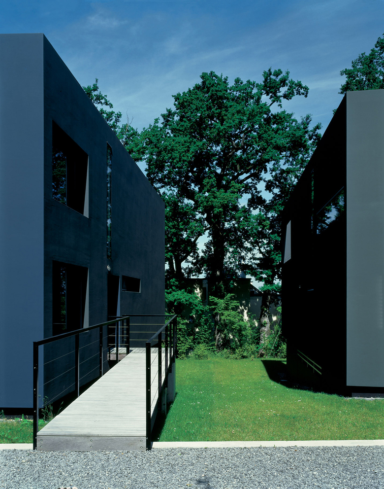 Der Zuschnitt des Grundstücks sowie die zweckorientierte Optimierung der Wohn-Nutzflächen führte zu zwei trapezförmigen Baukörpern. Die Volumen wurden parallel versetzt, sodass sie im Osten einen Zugangshof, im Nordwesten einen Gartenhof definieren. Durch die Kombination von dunkelgrün und dunkelblau gehaltenen Fassaden sind diese Aussenräume farblich spezifiziert. Die Brückenelemente der Eingänge überzeichnen die topografischen Verhältnisse und erhöhen die Privatheit der Einheiten. Auch die ausgeschnittenen hofartigen Öffnungen im Dachbereich gewähren als geschützte Loggien trotz hoher Dichte Privatheit. Die Variation der Grundrisse hatte Einfluss auf die Anordnung und Grösse bestimmter Fenster, und damit auf die Fassadengestaltung. Formal bezeichnend sind reduzierte Details für Dachränder und Fensterbänke. Unterschiedlich tief eingesetzte Fensterflächen entsprechen der räumlichen Situation im Innern sowie der Notwendigkeit, je nach Fall, von Storen-Stürzen. Diese charakterisieren den Ausdruck der Gebäude und relativieren die Kargheit der äusseren Erscheinung.