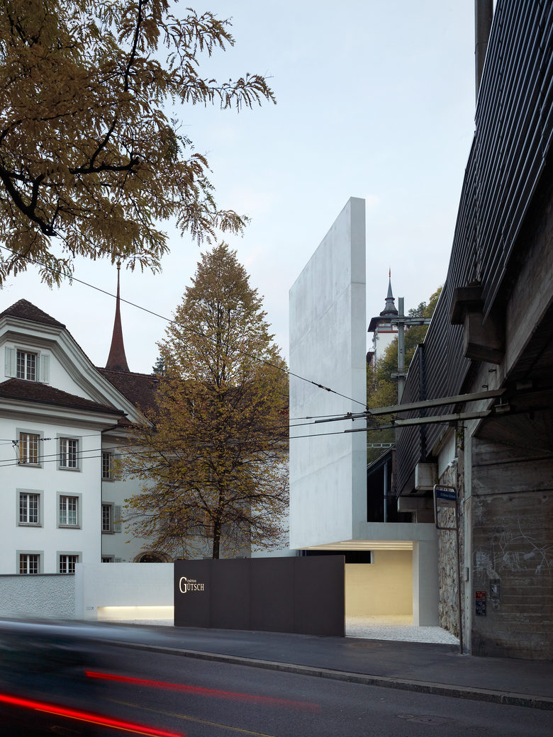 Das Projekt setzt sich mit der Überlagerung und Begegnung von drei verschiedenen Verkehrswegen an einem Punkt auseinander: die Gütschbahn, die darüberfahrende Gotthardeisenbahnlinie sowie die Baselstrasse als Haupteinfallstrasse Luzerns.
