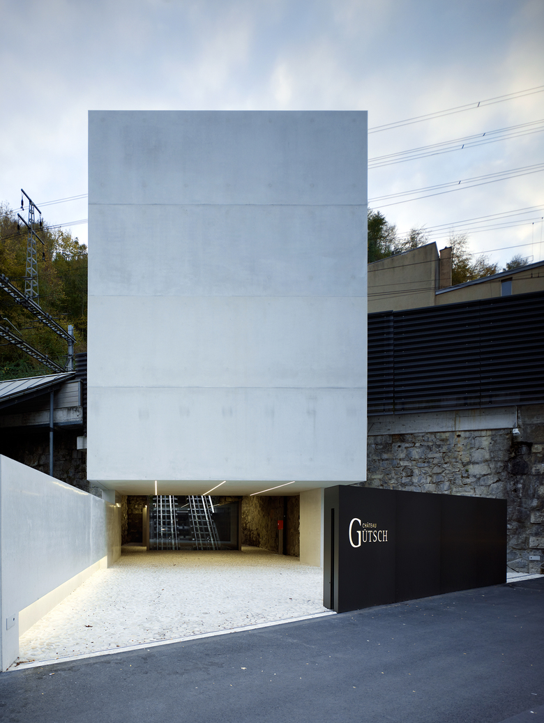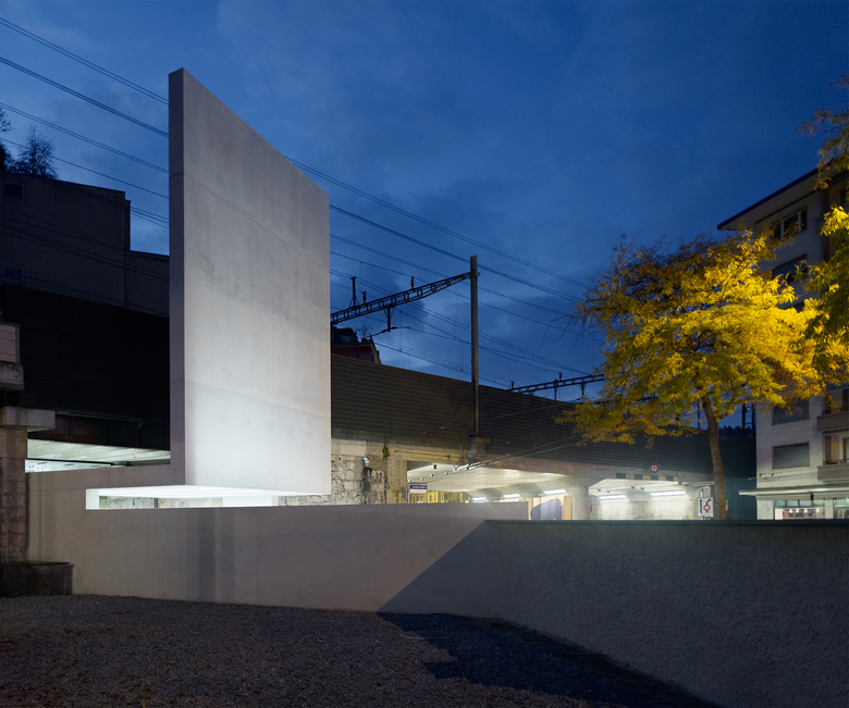 Städtebaulich entsteht ein offener Raum beim Zugang der Bahn im Sinne eines gedeckten Platzes an der Baselstrasse. Das eigentliche Stationsgebäude besteht räumlich aus den Brückenköpfen, dem SBB Trassee und einer Ergänzung in Form eines grossen Schildes aus weissem Sichtbeton. Die Wandscheibe nimmt als Projektionsfläche die Idee einer Stationsfassade wahr, welche die, durch den Abbruch entstandene Leere, neu bespielt. Die weisse Farbe der Betonkonstruktion und die Materialisierung des Bodens mit rundem Kopfsteinpflaster beziehen sich auf das weisse Schloss Château Gütsch und seinen Burghof.