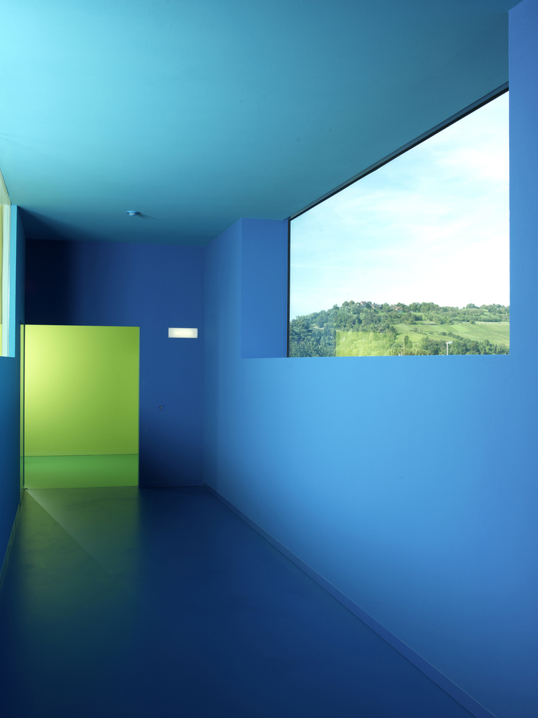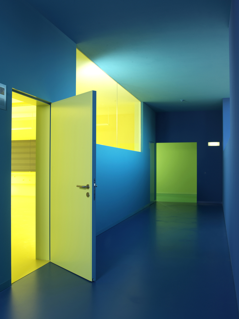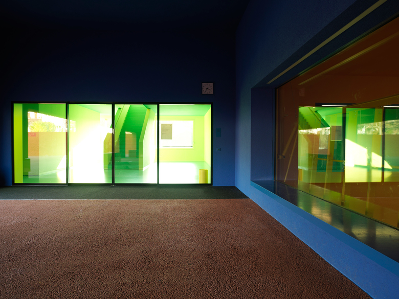 Jeder Trakt besitzt eigene gedeckte Zugänge und weist zu angrenzenden Volumen und Aussenräumen gedeckte Verbindungen auf. Diese Gliederung erhöht im Zusammenspiel mit dem inneren Farbkonzept die Identifizierbarkeit der Räume und erleichtert die Orientierung im Schulhaus und die Auffindbarkeit der Unterrichtseinheiten.