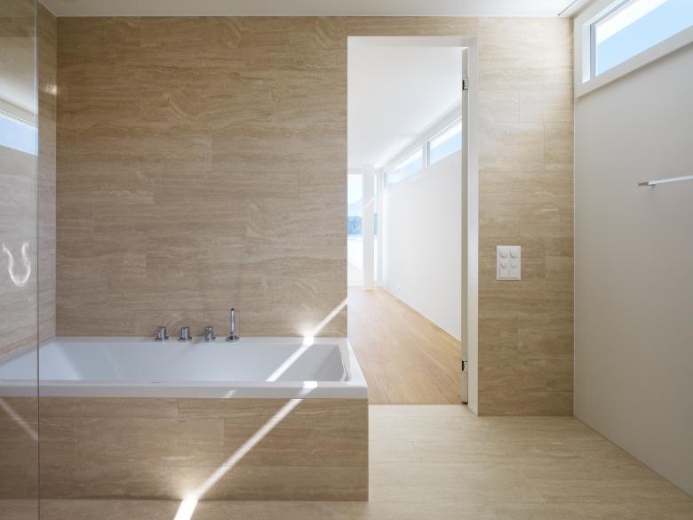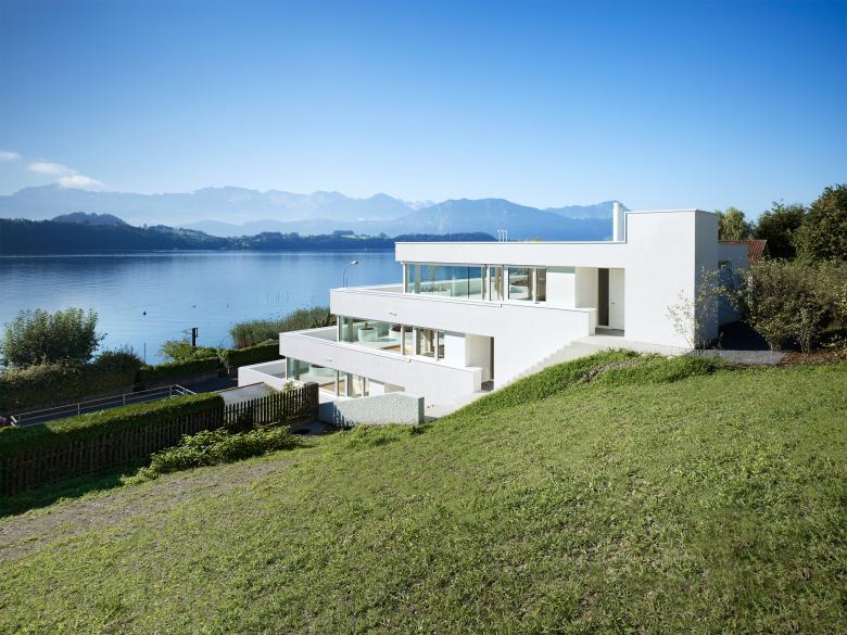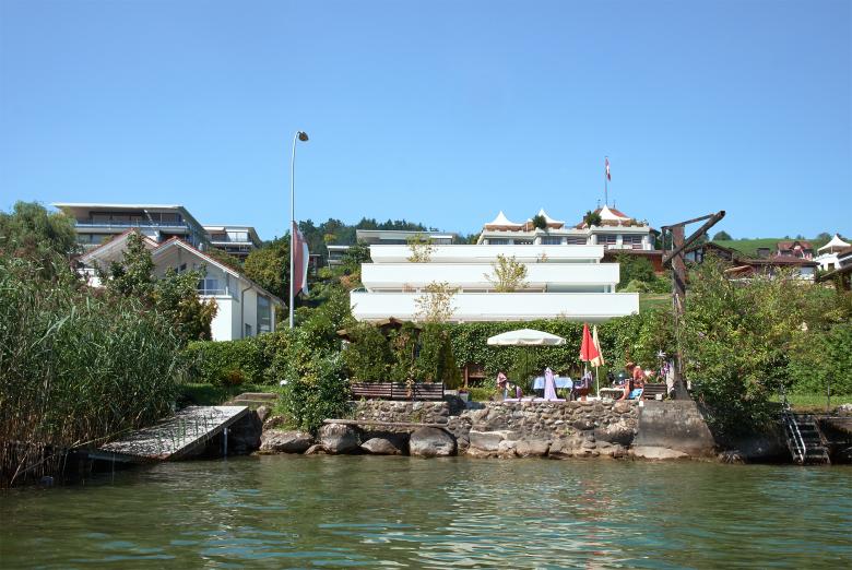 Räumlich zeigen sich die Wohnungen als fliessender Innenraum, welcher vom Eingang zum Wohn- Essraum bis hin zur grosszügigen Ankleide vor dem Elternzimmer sich entwickeln und zum begrünten Aussenraum mit Ausblick auf den See und die Berge sich orientieren. Die Materialisierung des Gebäudes ist charakterisiert von einer durchgehenden Gestaltung der Fassaden mit weissem Kratzputz, von weiss einbrennlackierten Fensterdetails und Brüstungsgeländern. Im Innenraum herrschen warme Materialien vor, wie Eichenbretterparkett und mit Kastanienholz furnierte Einbauschränke und Küchenfronten. Die Wand- und Bodenbeläge in den Bädern sowie auf den Terrassen sind mit grossformatigen Travertinplatten belegt. Die Anlage weist vier Geschosse auf, welche im Erdgeschoss den Hauszugang mit Briefkasten, Container, Fahrradeinstellplätze sowie acht Autoparkplätze aufweist. Die drei Vier-Zimmerwohnung mit grosszügigen Terrassen werden über einen internen Aufzug von der Garage direkt erschlossen oder können auch von aussen über eine Freitreppe im Garten erreicht werden.