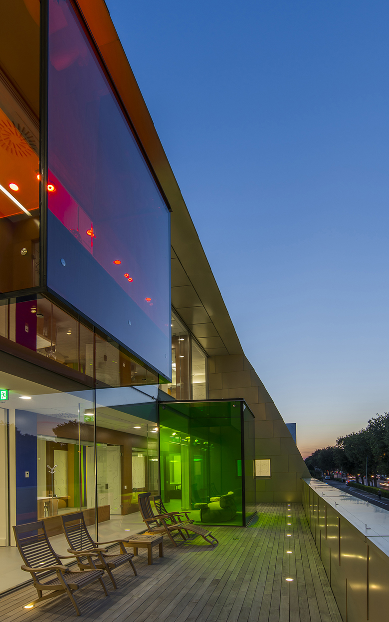 L’edificio realizzato consta di complessivi 4500 mq e si sviluppa su 3 piani fuori terra e uno seminterrato. Ai piani superiori si trovano gli uffici direzionali e amministrativi, gli spazi della distribuzione, quelli di relazione e altri locali di servizio come i bagni, i locali tecnici e i collegamenti verticali; al piano interrano si trovano l’auditorium con circa 300 posti e un ampio spazio adibito ad area espositiva e per eventi.
