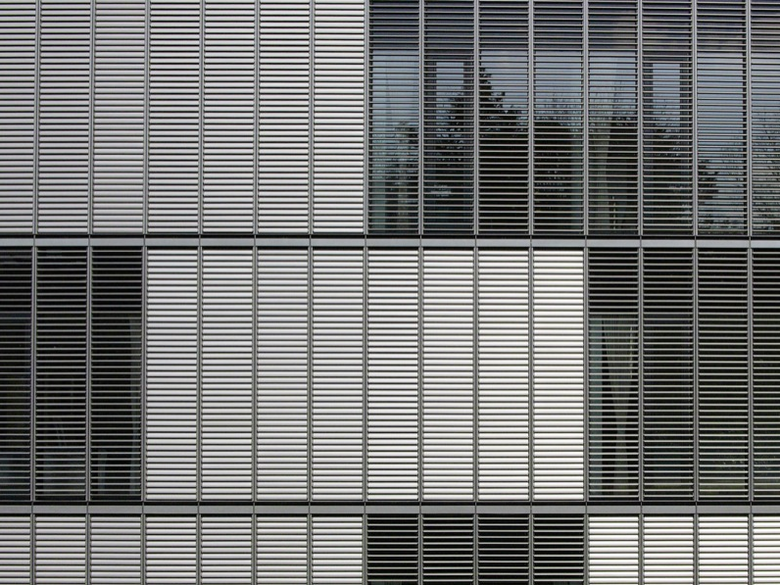 das Bestreben nach Offenheit und Benutzerfreundlichkeit. Die Fassadenkonstruktion nimmt den notwendigen außen liegenden Sonnenschutz auf. Der räumliche Abschluss erfolgt mit großflächigen Verglasungen in Aluminium-