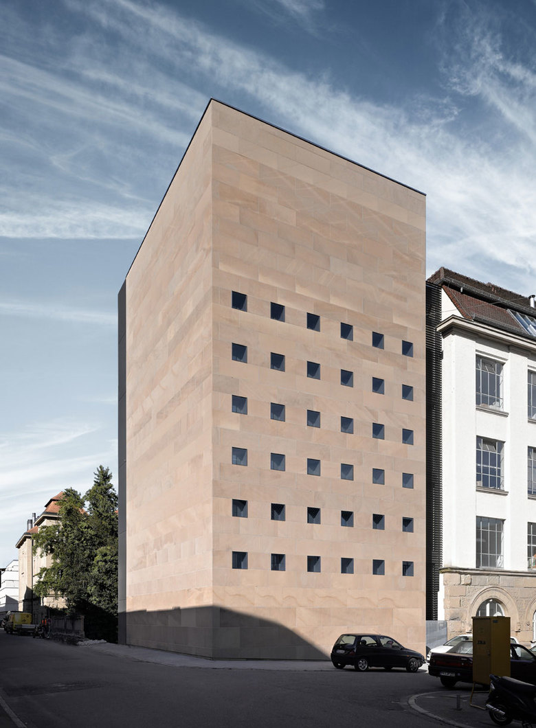 Der Erweiterungsbau in der Holzgartenstraße 36 bildet den baulichen Abschluss der bestehenden dreiflügligen Anlage der Fakultät für Gestaltung aus dem Jahr 1911. Der u-förmige Grundriss des Neubaus öffnet sich transparent zum Hof und bildet einen massiv geschlossenen Rücken zur Straße. Das zurückgesetzte Treppenhaus verbindet beide Bauten. Die Materialität des 6- geschossigen Baukörpers nimmt Bezug auf den Bestand. Sandstein, Stahl und Glas strukturieren die Fassaden des Gebäudes. Die rückwärtige Sandsteinfassade gliedert sich durch kleinteilige Kastenfenster und betont die Massivität der Konstruktion aus Ortbeton. Die Glasfassade zum Hof formuliert einen spannungsvollen Kontrast zum Bestand. Eine vorgelagerte Loggia vermittelt zwischen dem Innenraum und dem Hof. Die klare geometrische Gestalt des Neubaus ergänzt in seiner gestalterischen Zurückhaltung das historische Ensemble selbstbewusst und vervollständigt die Anlage.