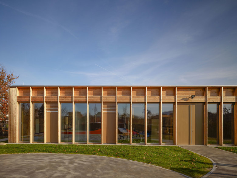 Das Zimmer im Grünen – Die eingeschossige Kita befindet sich am Süd-Ost-Rand von Frankfurt in Schwanheim und hat Raum für sechs Gruppen. Im Vorbeifahen wirkt die rhythmisch gegliederte Fassade wie die benachbarte Wohnbebauung, kleinteilig und zurückhalted. Die Erschließung erfolgt von Osten über die Straße Zur Waldau. Dieser Eingangsbereich ist geprägt von zwei großen Bestandsbäumen. Das Gebäude mit dem homogenen Holzkleid fügt sich mühelos in die Umgebung ein. Die rhythmische Gliederung des Volumens durch die eingeschnittenen Höfe verzahnt das Haus mit der umgebenden Landschaft und die HAus- und Hof-Abschnitte erhalten angemessenen, kindgerechte Proportionen. Jeder Gruppe ist ein direkten Außenraum zugeordnet, ein Zimmer im Grünen. Die Krippenkinder können sich dadurch innen und außen bewegen und sind durch die raumhohe Verglasung immer im Blickbereich der betreuenden Personen.