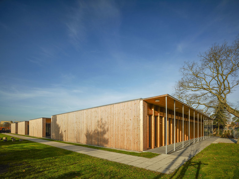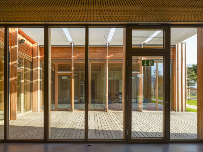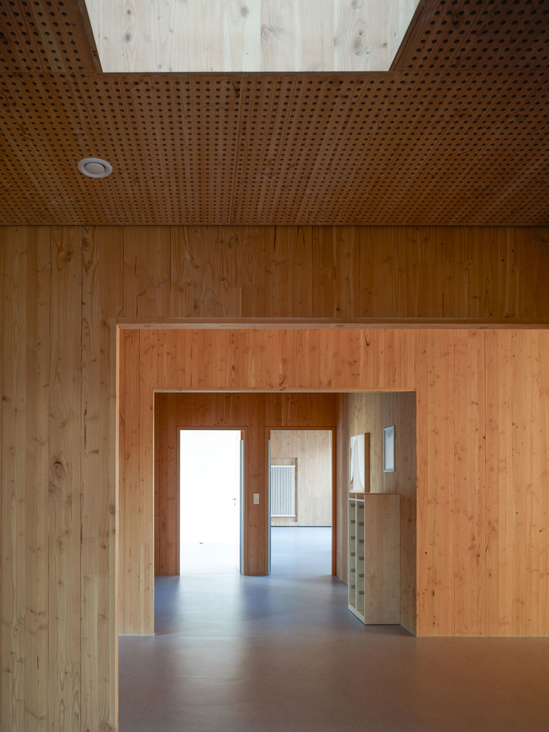 Massive Holzwände im Inneren tragen die vorgefertigten Dachelemente aus Holz und verleihen den Räumen eine ehrliche und natürliche Atmosphäre. Die Orientierung der Grppen zu den Höfen mit heschosshohen Glaselementen erweitert die Aufenthaltsräume bis in die Höfe und schafft so ein großzügiges Raumerlebnis.