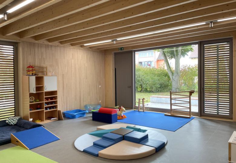 und Ausblicke, so dass die Kinder immer im Blick der betreuenden Personen sind. Der außen liegende Sonnenschutz wird mit Jalousien realisiert, diese lassen den Blick nach draußen auch in heruntergefahrenem Zustand zu.