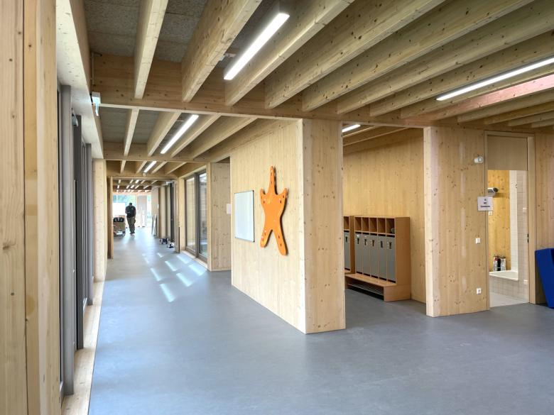 Mit seinen Nischen und Aufweitungen lädt er zum Spielen ein und erlaubt durch seine Öffnungen in Richtung Park interessante Blicke in die Natur. Er erschließt, beginnend im Foyer, den Verwaltungsbereich und die 3 Gruppenmodule und führt am Ende des Gebäudes in den Freibereich.