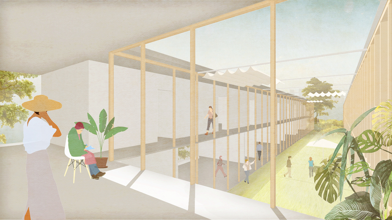 Wir schlagen vor mit dem Baukörper der Erweiterung einen Hof auszubilden. Durch die Anordnung von zwei Bausteinen als Winkelbaukörper entsteht ein schlanker, nach Süden offener Hof. Dieser Hof verbindet die Flächen der Psychosomatik im Bestandsgebäude mit den neuen gemeinsam genutzten Flächen der Erweiterung, wie Speise- und Aufenthaltsbereich. Der winkelförmige Baukörper vermittelt den Höhensprung zwischen Liebermeisterstraße und Eingangsebene der ViTa.