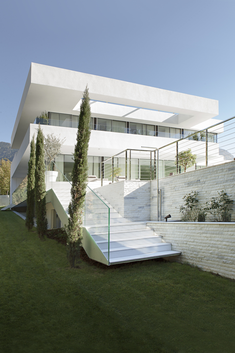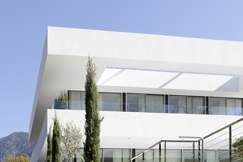 L’impostazione progettuale ideata dallo studio si ispira all’architettura moderna con volumi line- ari e grandi aperture vetrate che permettono di vivere senza soluzione di continuità spazi interni ed esterni. Ed è proprio il particolare clima mite di Merano, antica meta di villeggiatura frequentata da personaggi illustri come Franz Kafka o l'imperatrice Sissi, ad avere suggerito un’alternanza di spazi chiusi e aperti in continuità formale e funzionale con il giardino e l’area relax della piscina.